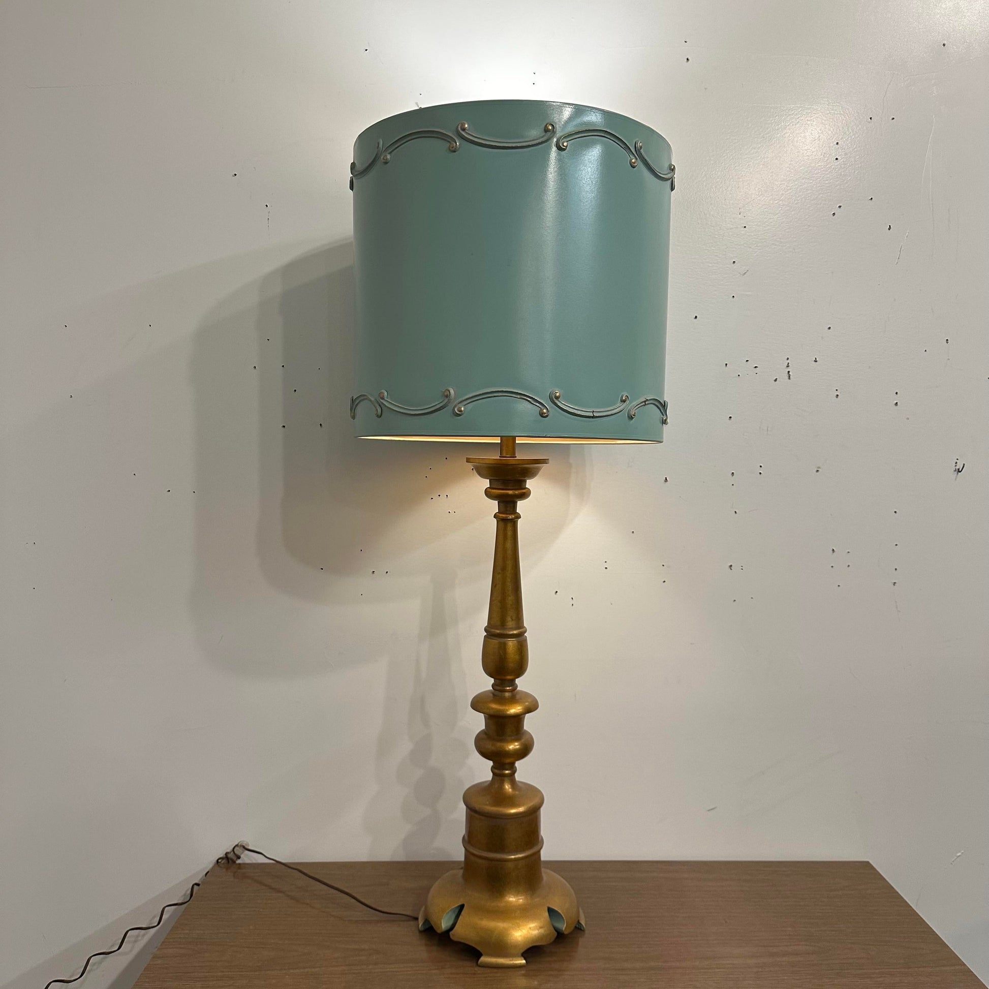 This lamp features giltwood style turned base with painted blue details. The lampshade is blue with sculpted giltwood details. There is no makers mark on the lamp.