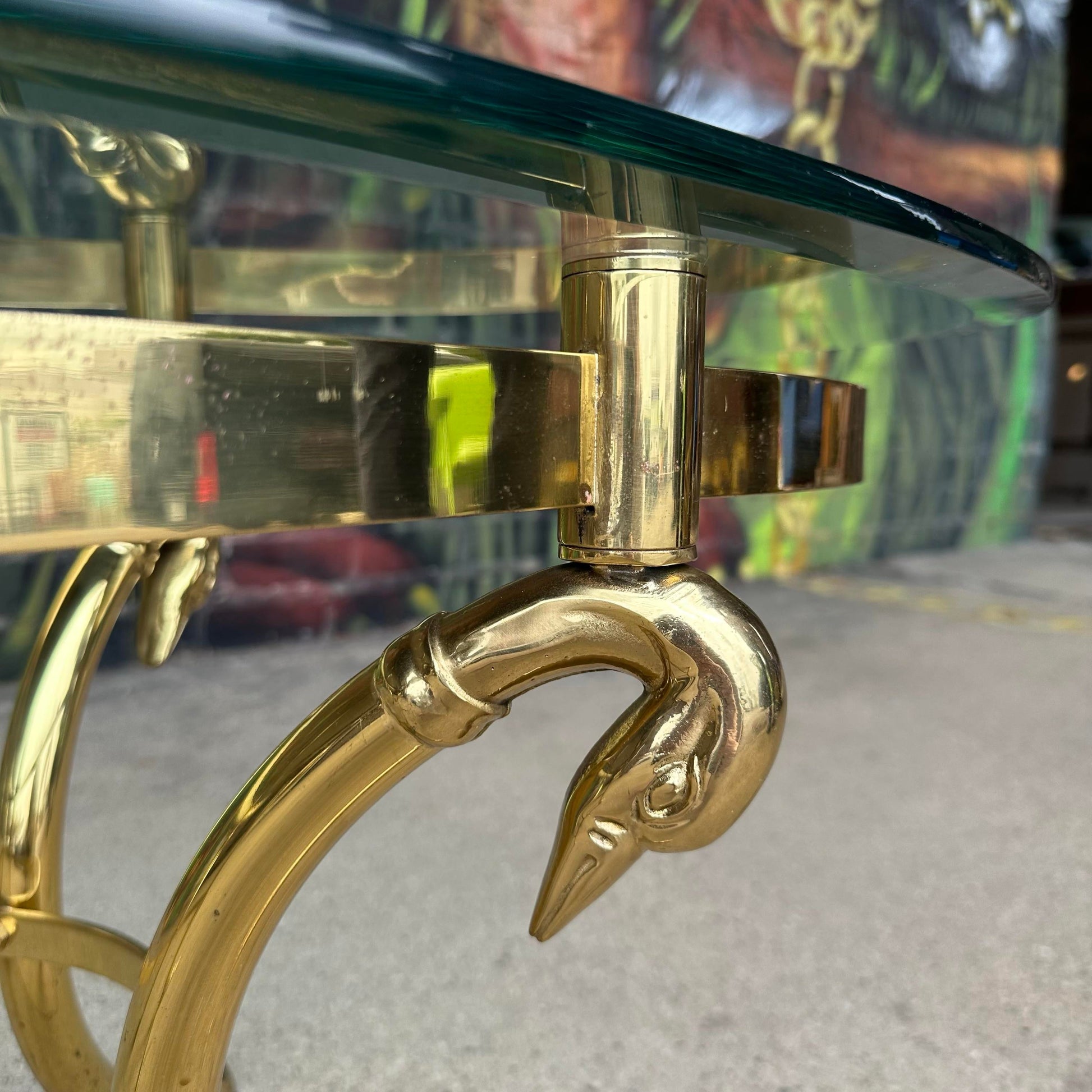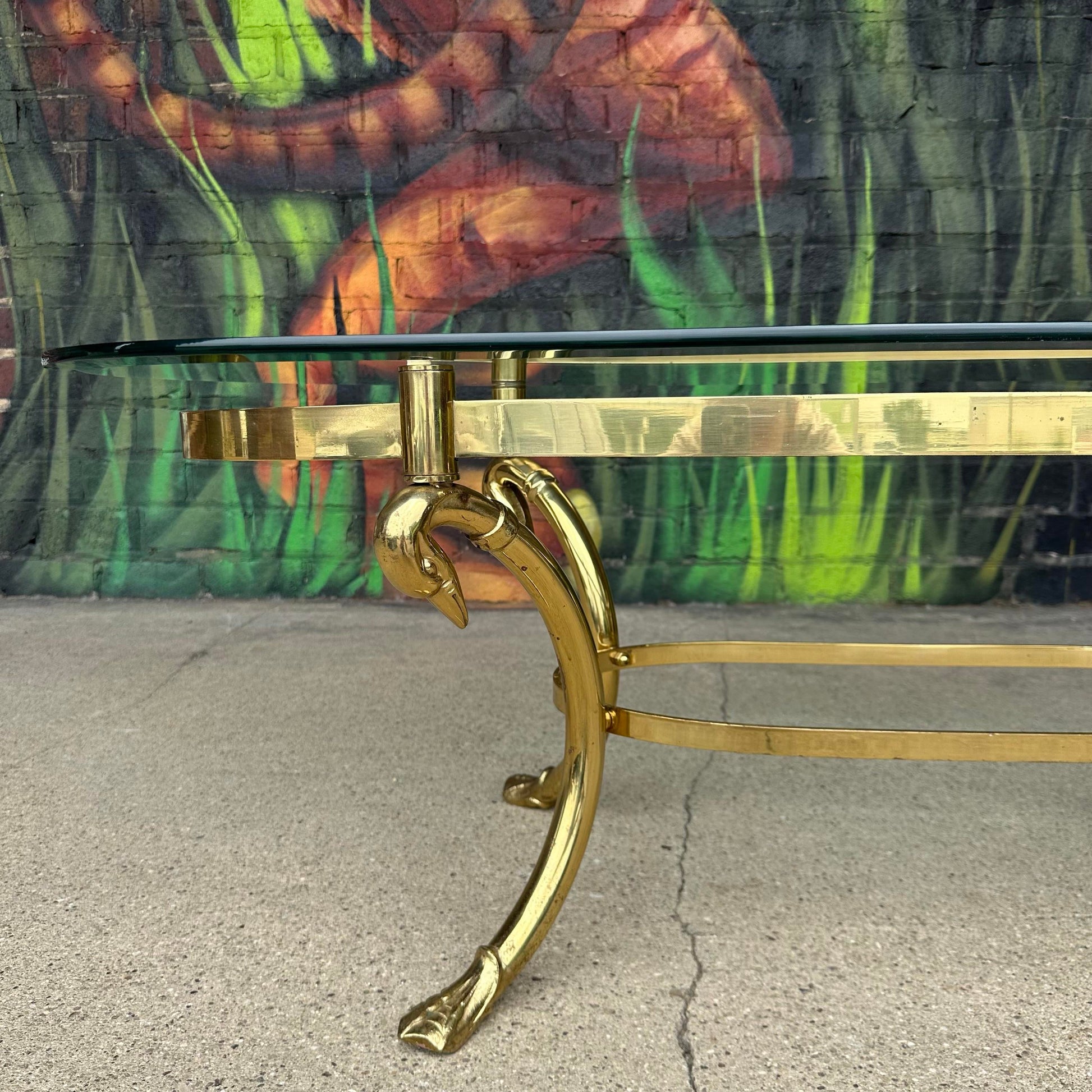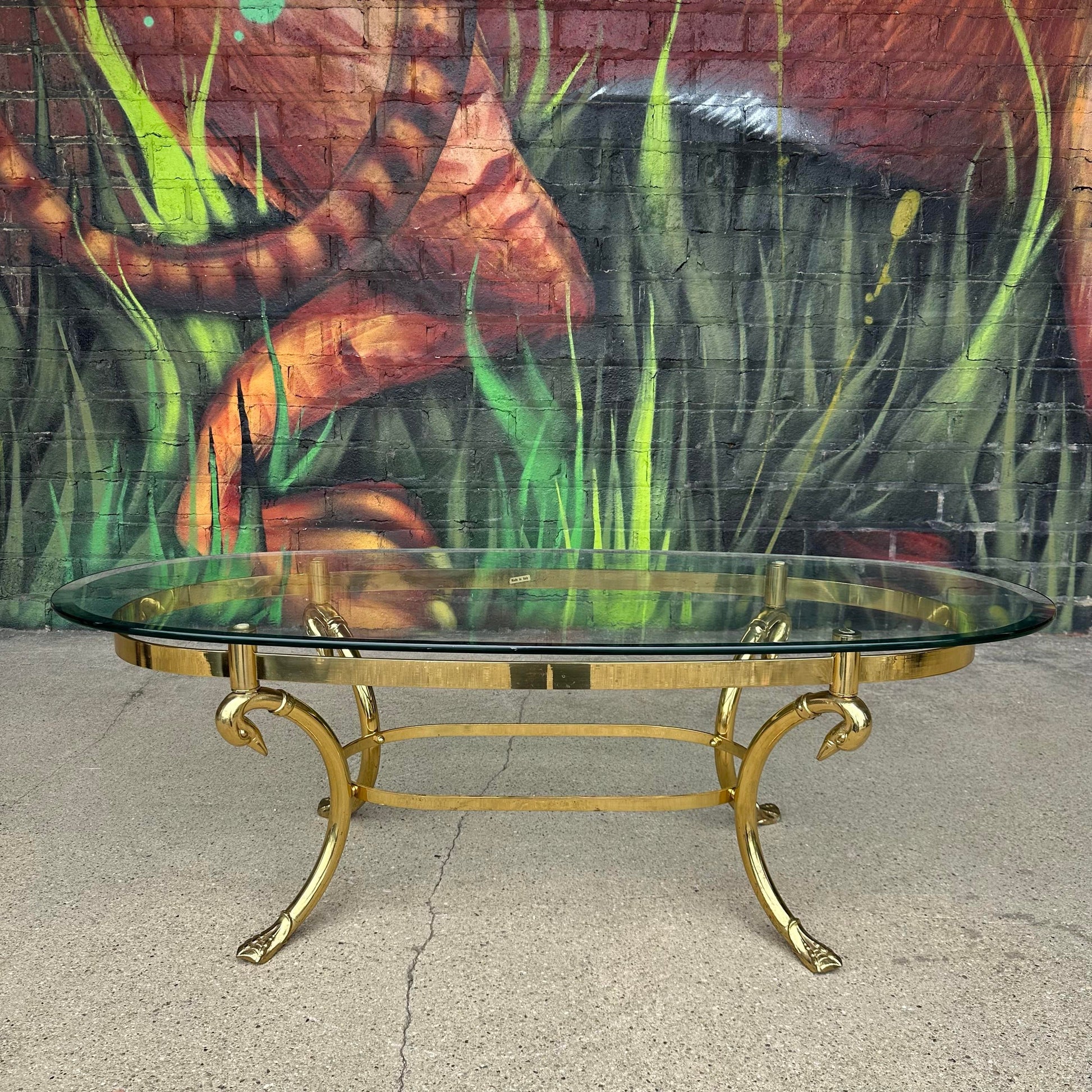 This is a beautiful oval brass and glass Italian made coffee table in the style of LaBarge. It features swan head and feet motifs as the base with an oval beveled edge glass top.