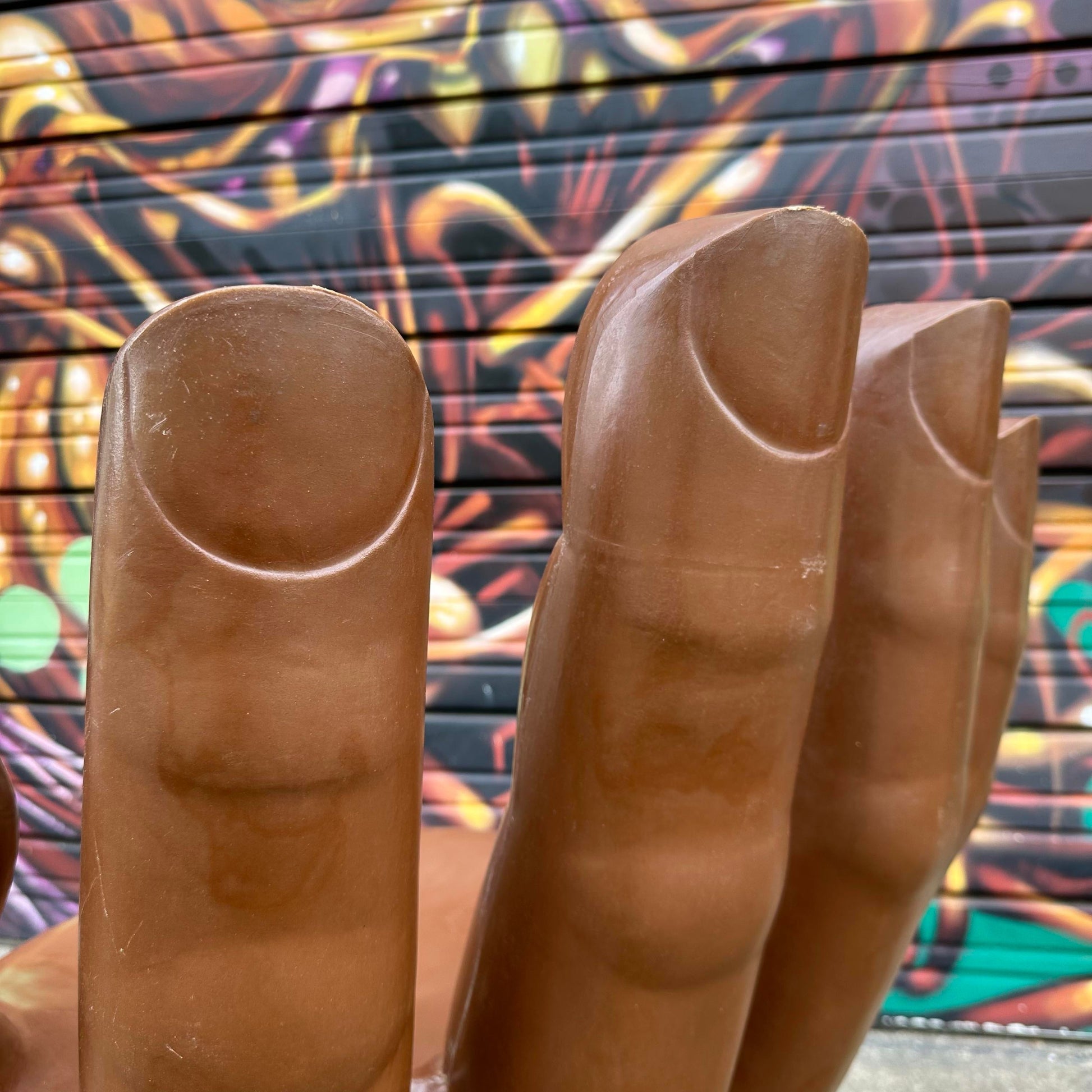 Mid Century Modern Hand Form Chair. You’re looking at the iconic hand chair made from formed brown plastic. This chair was made in the 70s and is an eye catching piece of furniture for many different spaces. There is no makers mark on the chair.