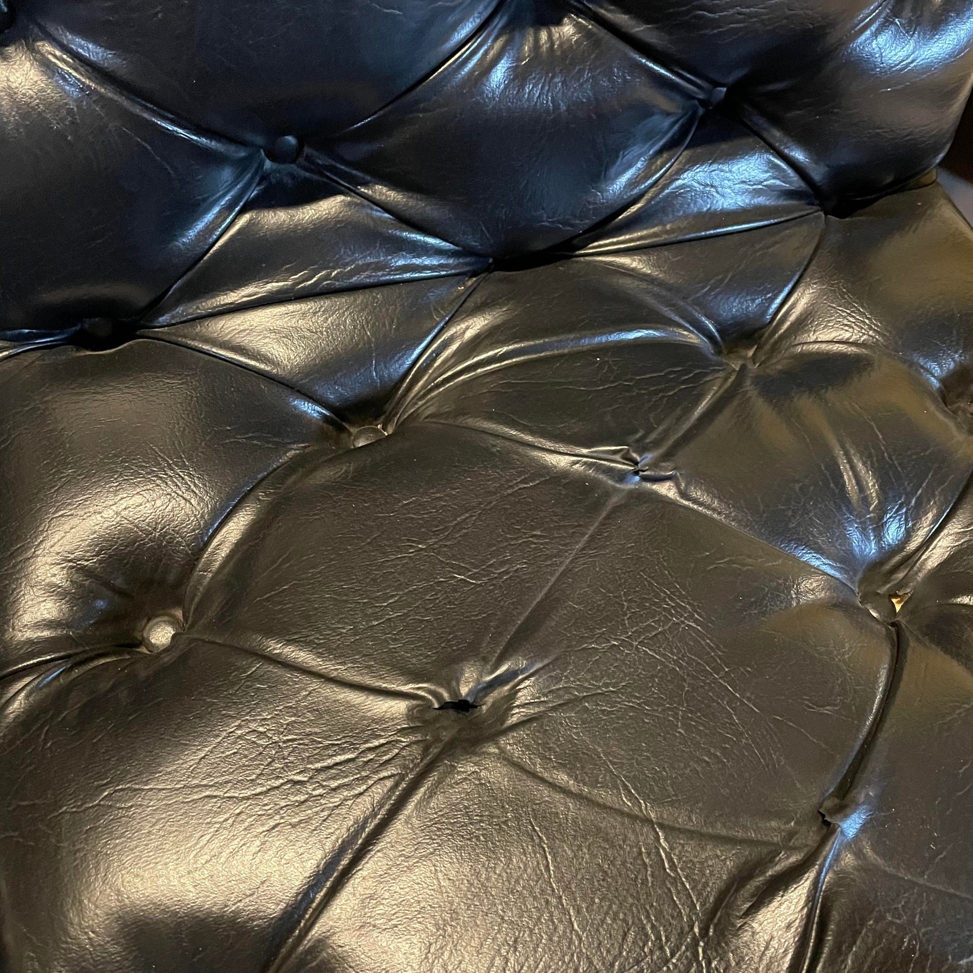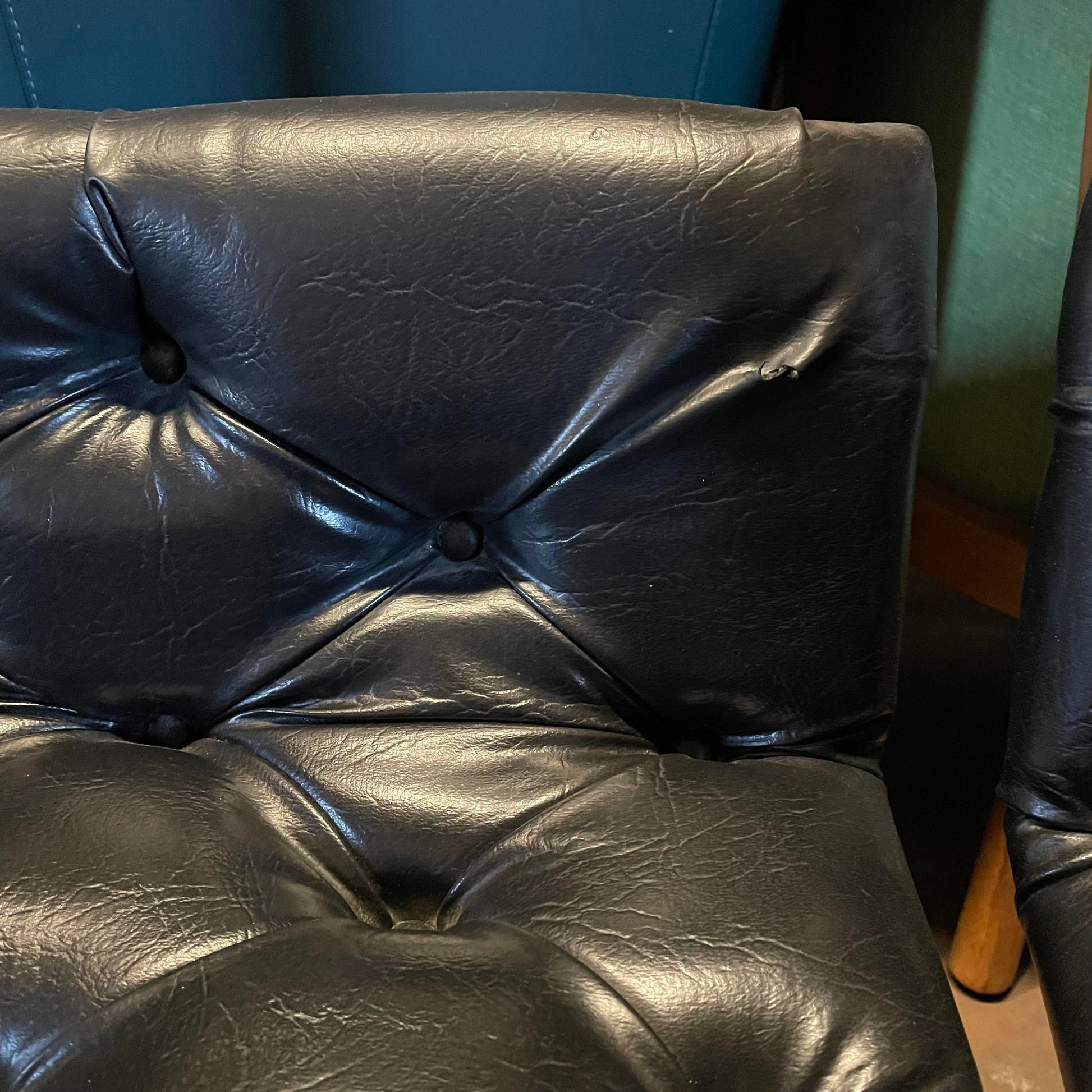 The chairs have a low back on the seat and are covered in vinyl.