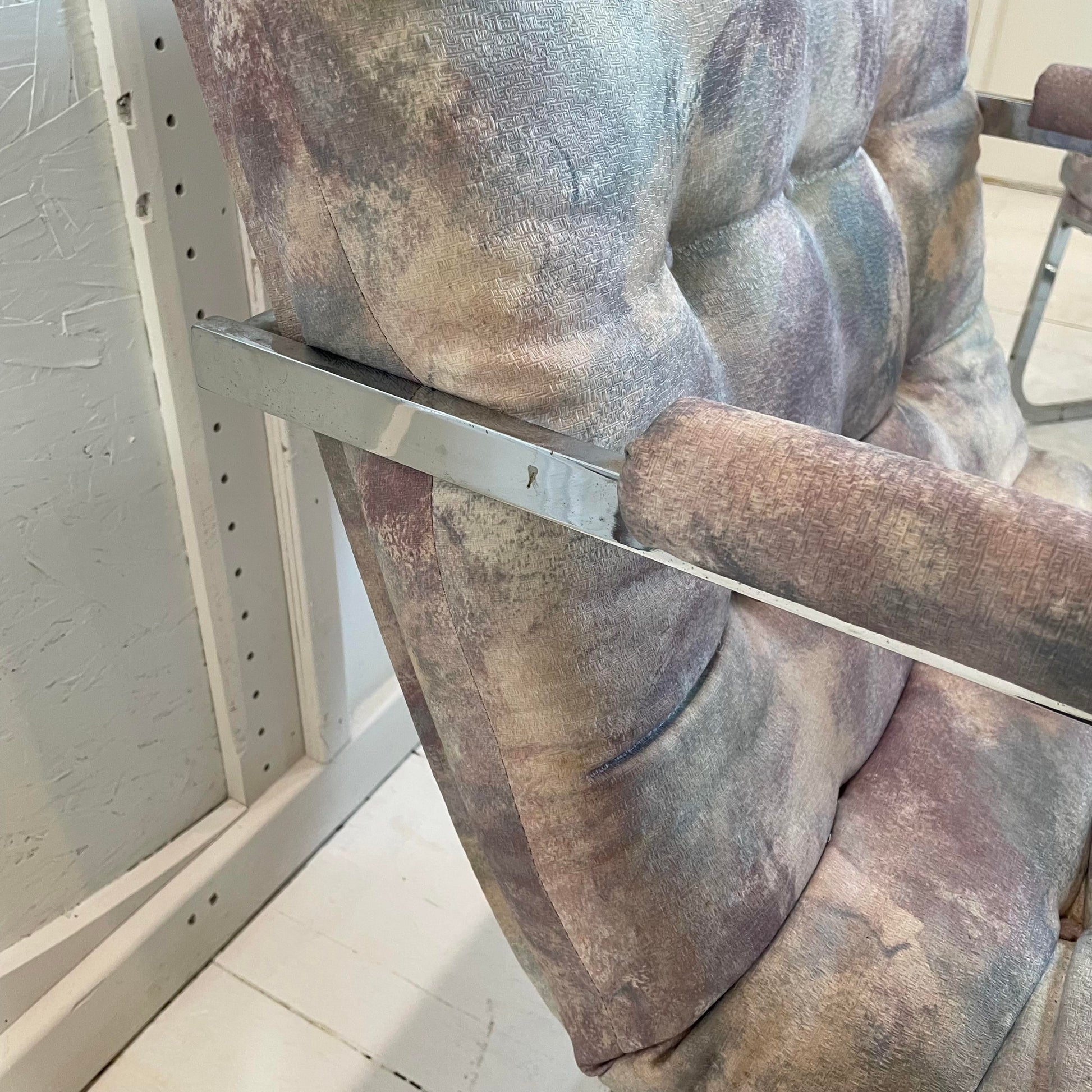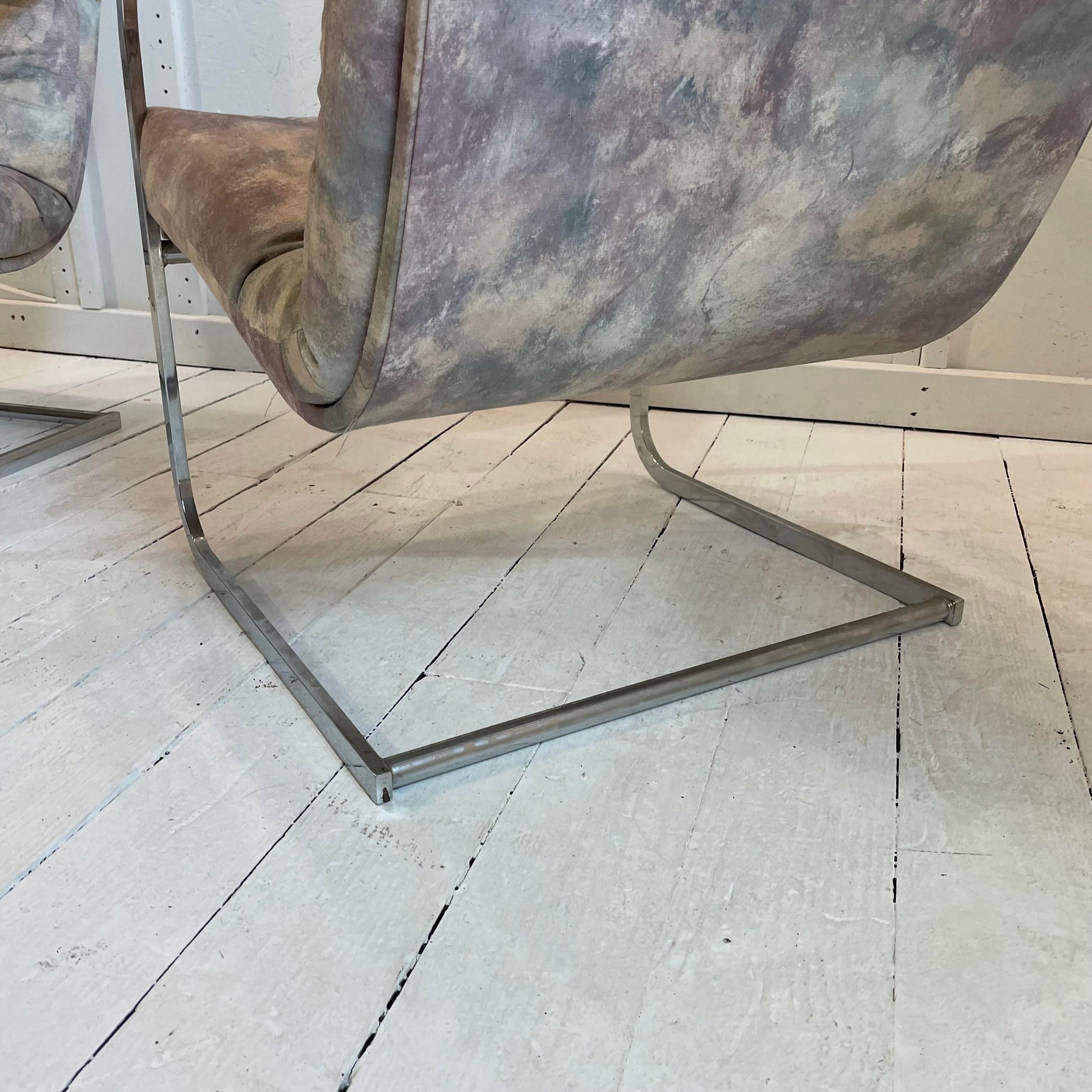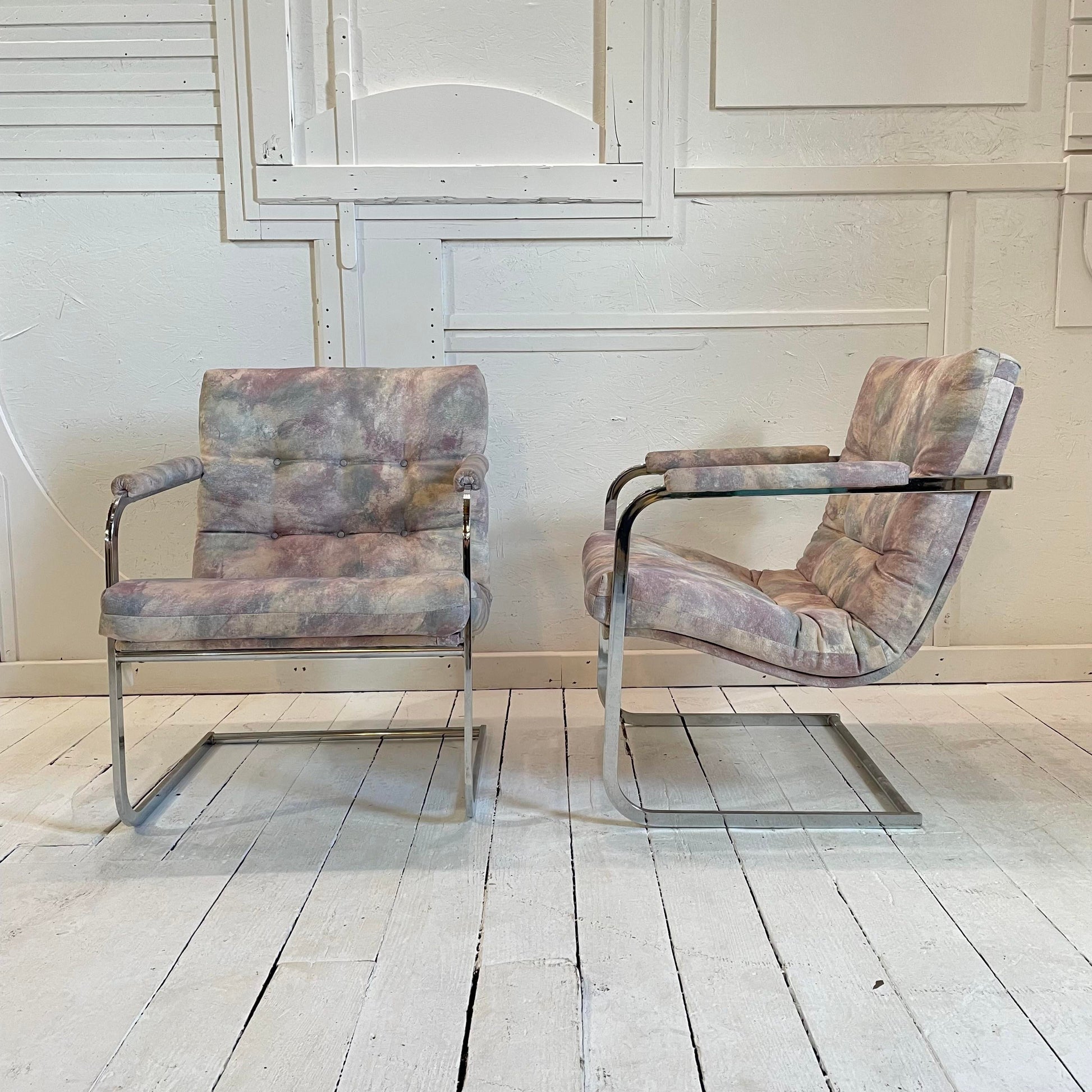 AmazIng pair of cantilevered club chairs. In 80’s fabric and chrome frames. These are not tagged but believe them to be a milk baughman design.