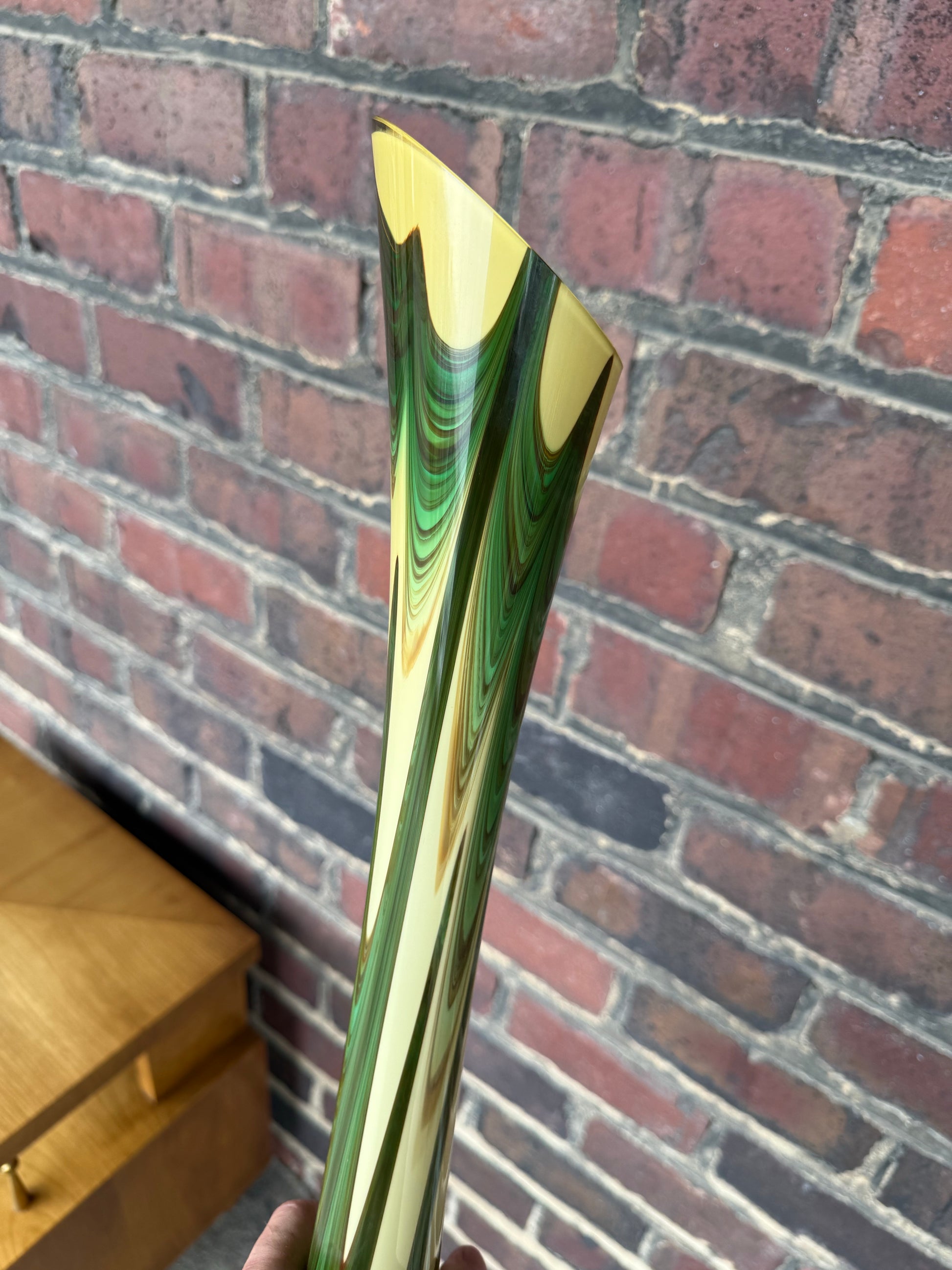 Striking 29-inch hand-blown glass floor vase featuring rich swirls of green, brown, and cream tones, beautifully layered over a crisp white interior. The organic color pattern gives it a natural, earthy elegance, while the tall, sculptural form makes it a perfect statement piece for any modern or eclectic space. Maker is unknown, but the craftsmanship and presence suggest studio or artisan production.