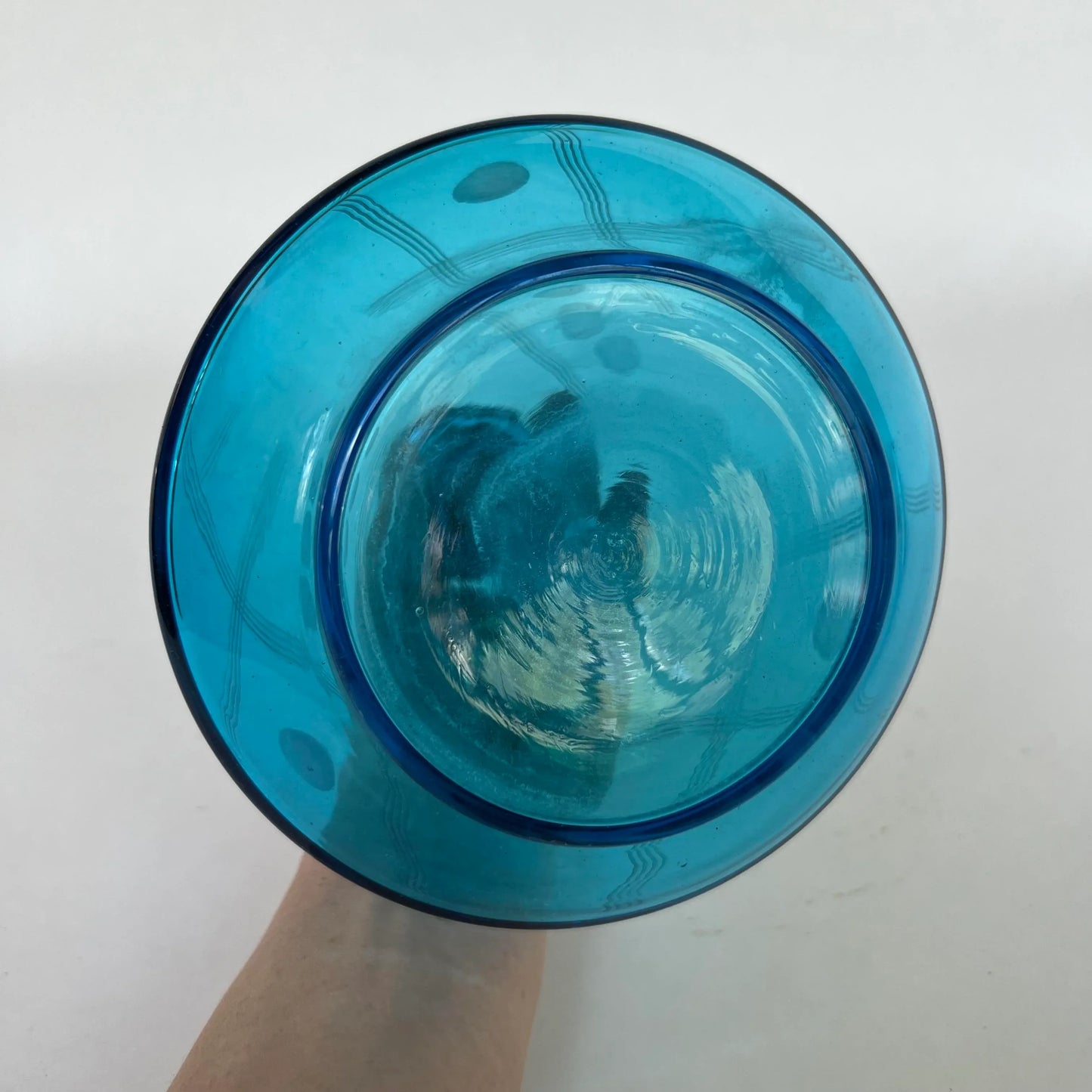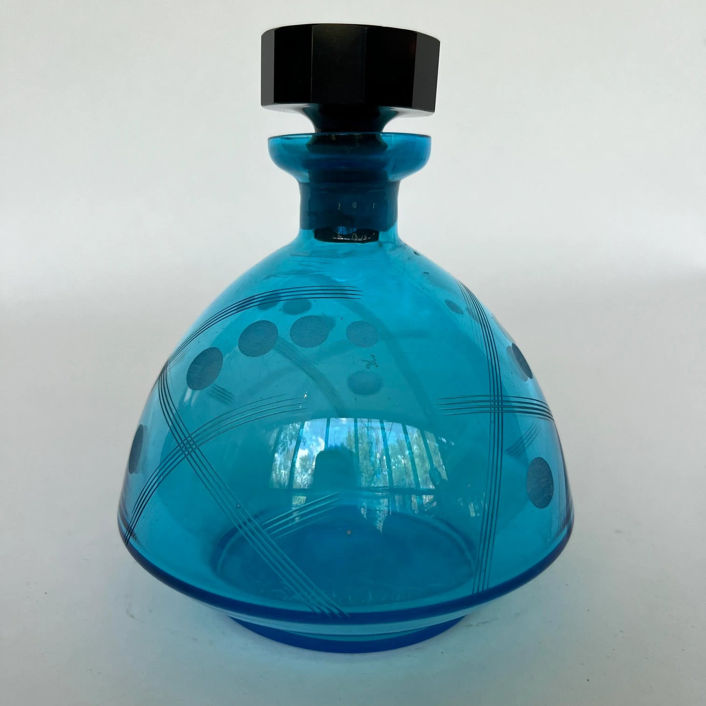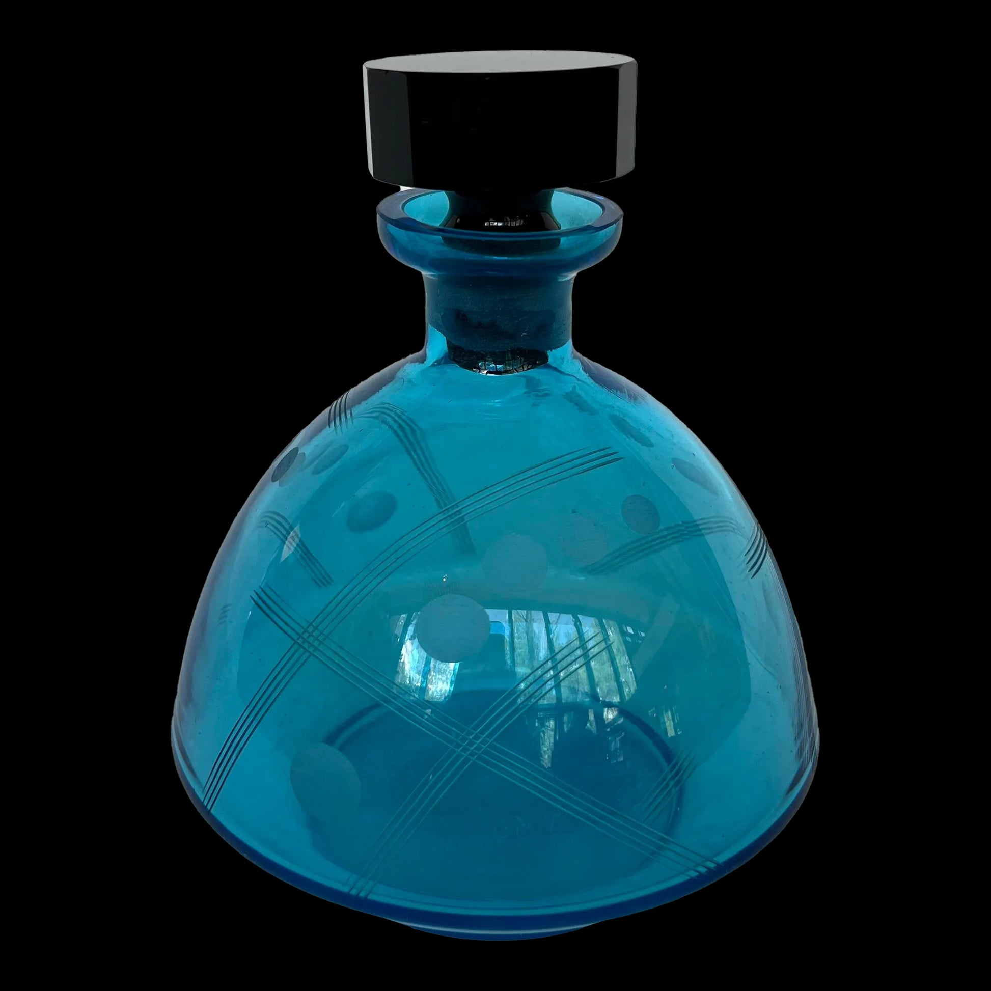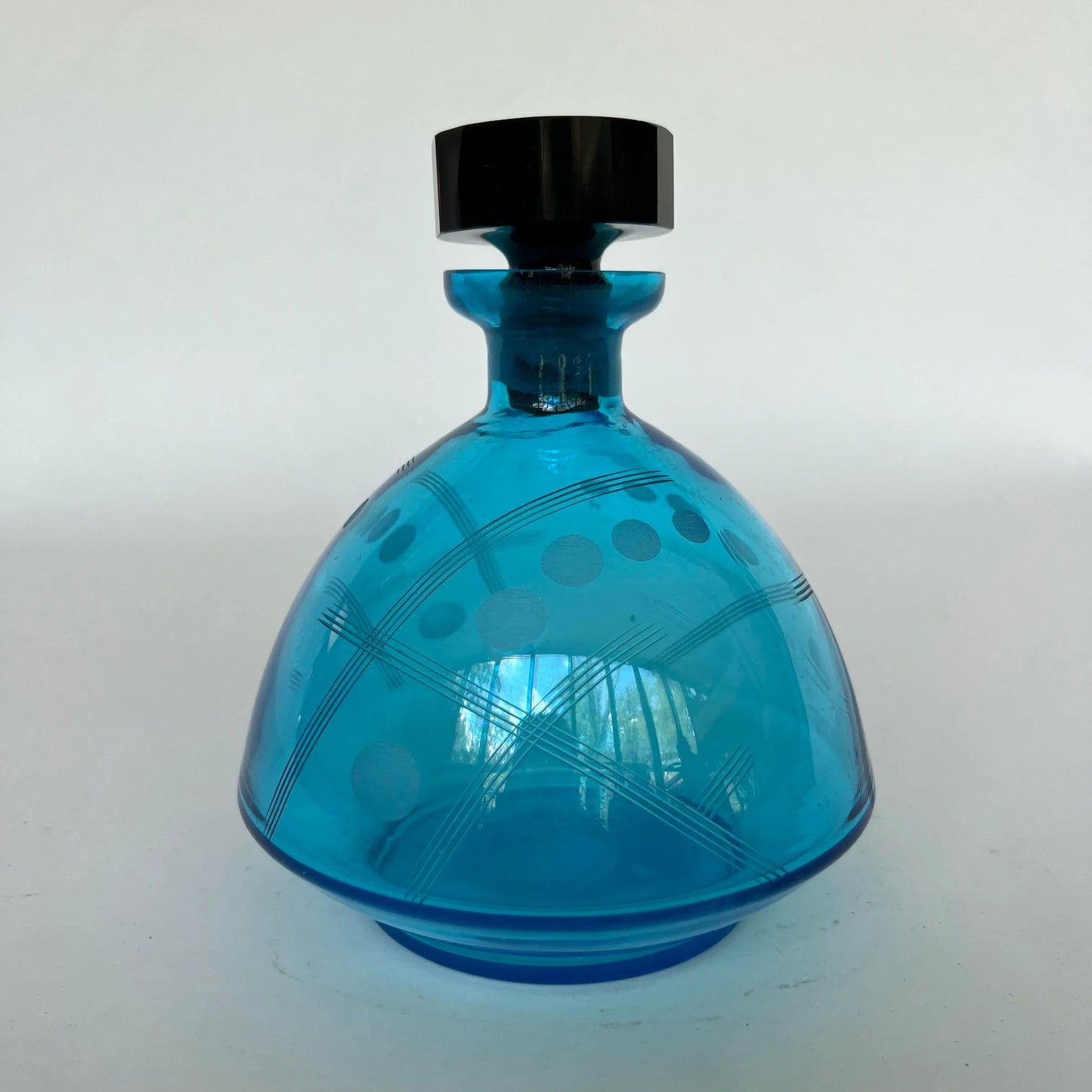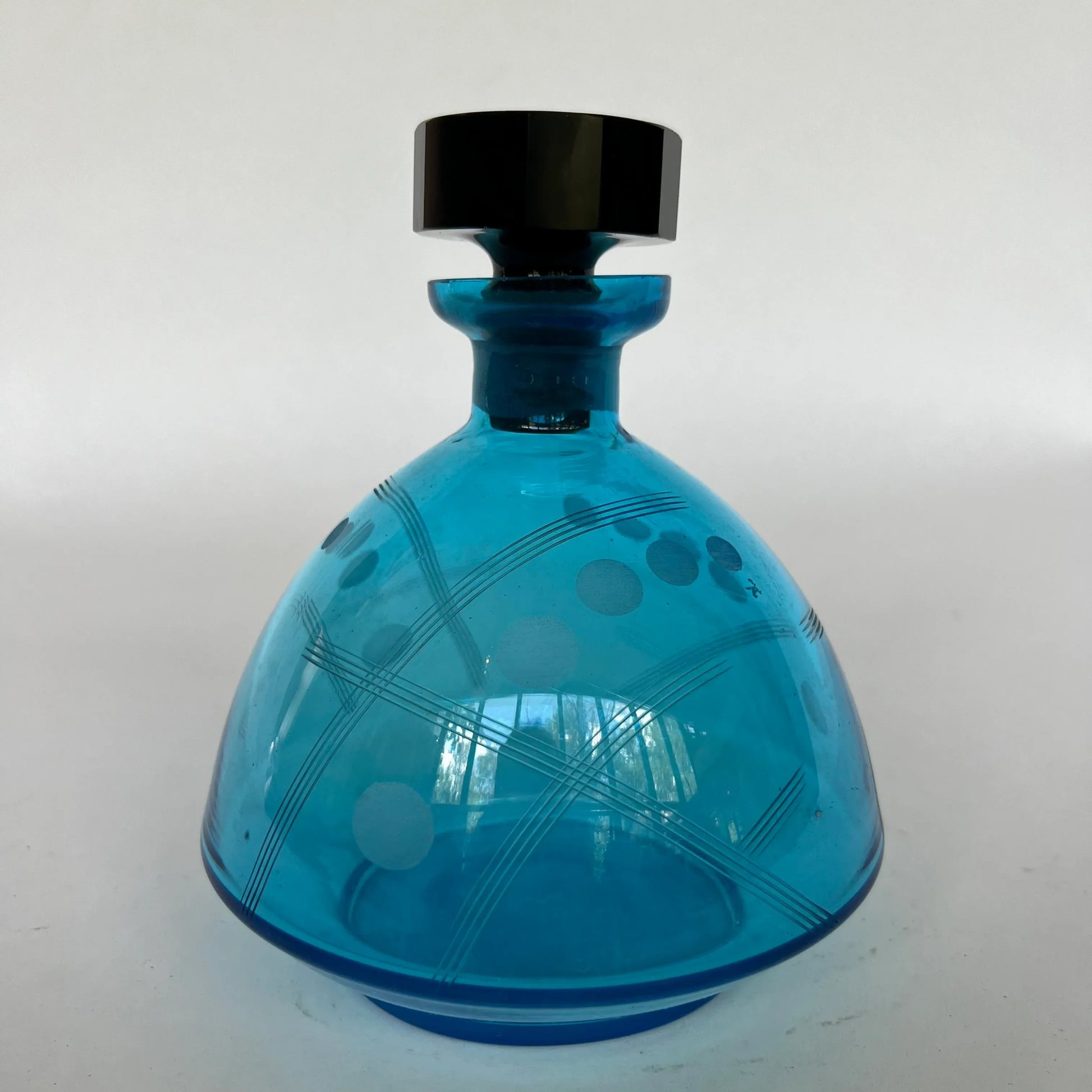 This Walter Seig blue glass decanter is a stunning example of mid-century artistry and craftsmanship. Featuring a sleek, elongated silhouette with a vibrant blue hue, this piece is both functional and decorative. The decanter boasts clean lines, a tapered neck, and a perfectly fitted stopper, making it an ideal addition to any barware collection or as a centerpiece on display.