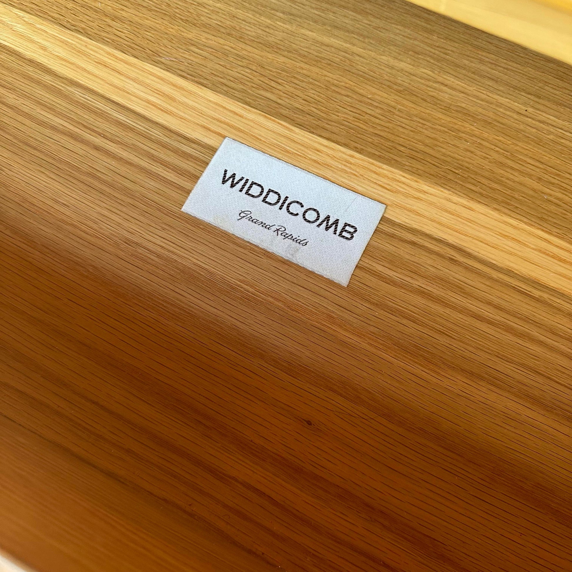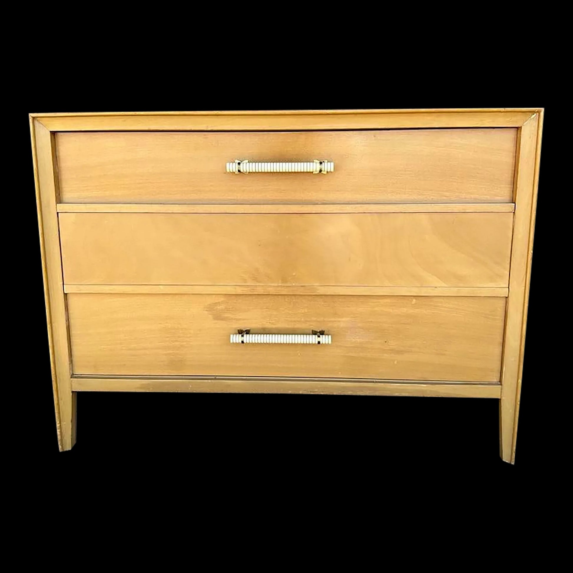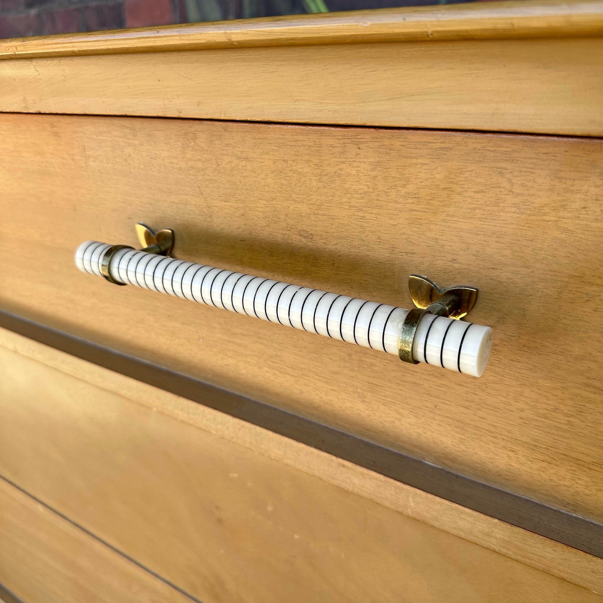 Low dresser or chest of drawers by Widdicomb. This piece is constructed of bleached mahogany with brass and ivory colored detailing. This is a rare design from Widdicomb.