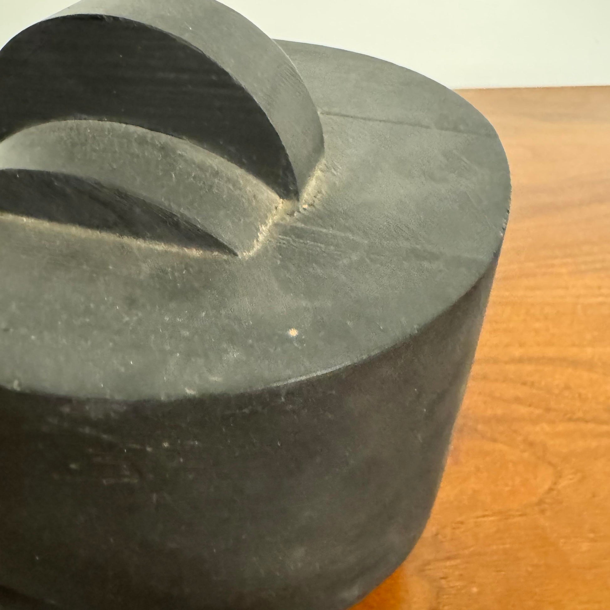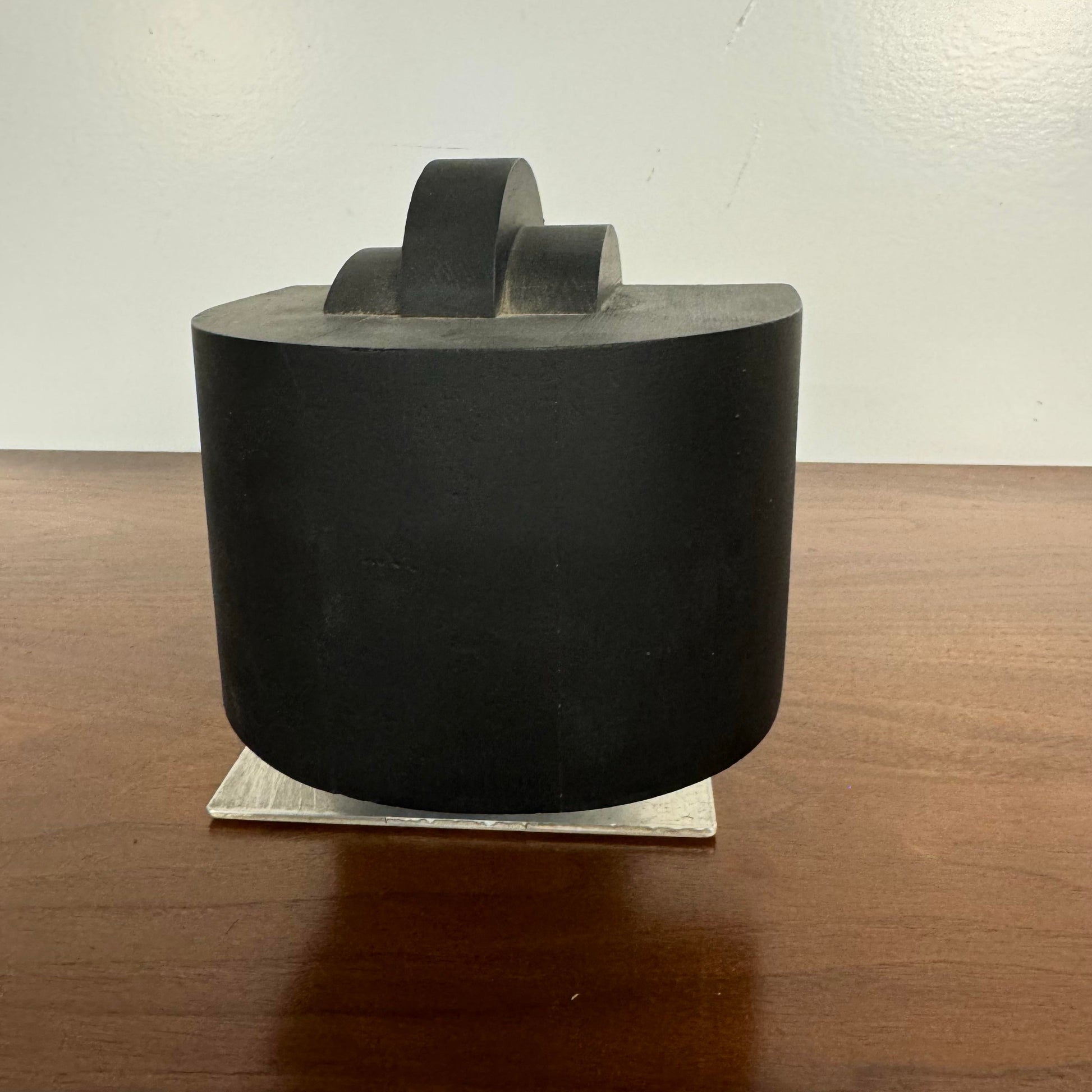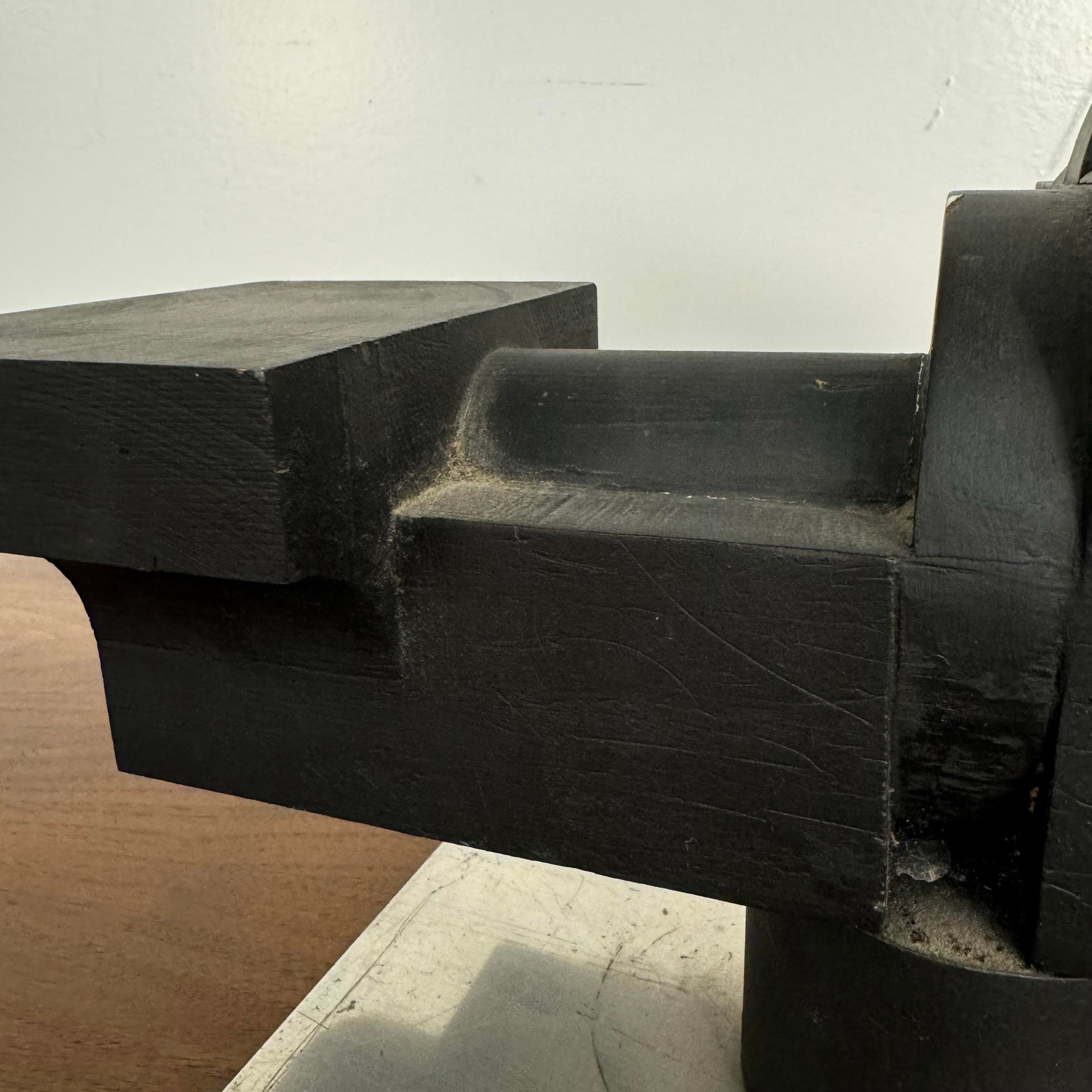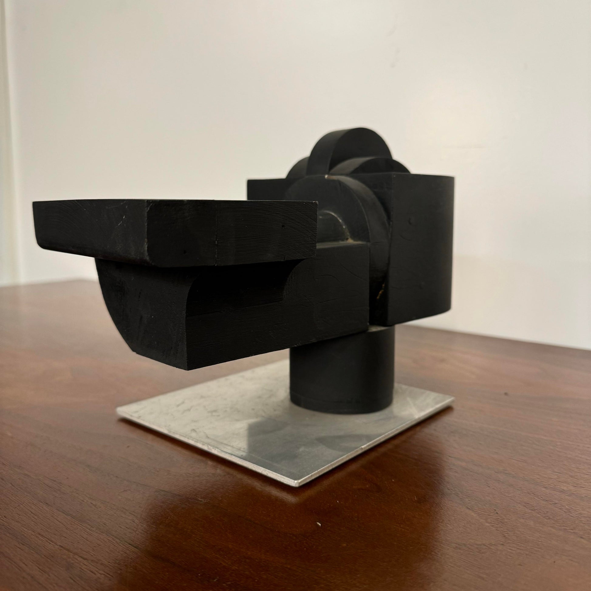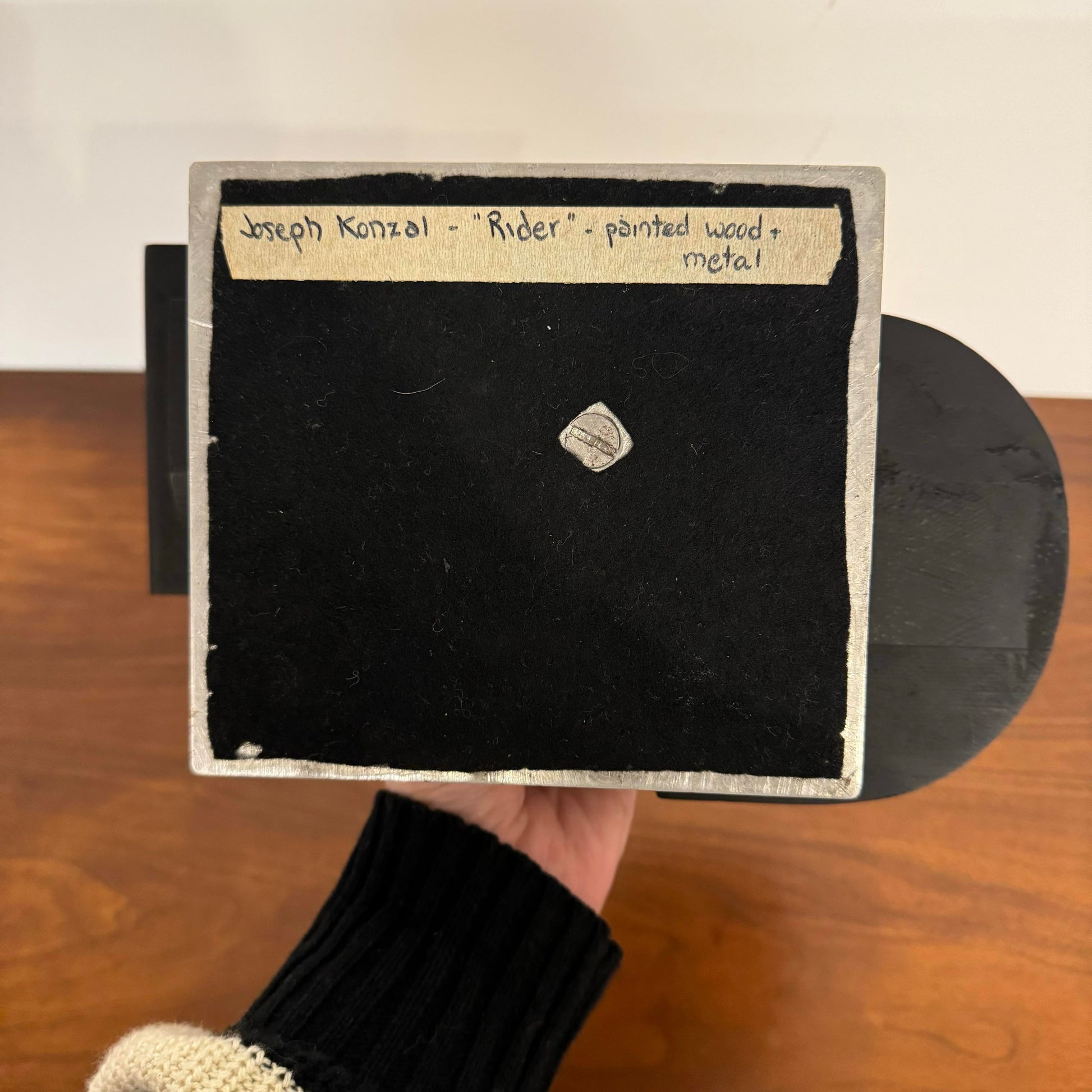 This sculpture was created by Wisconsin-born artist Joseph Konzal. It is constructed of ebonized or black painted wood on a thin sheet metal base. This piece features bold geometric forms in a cubist manor. His work is in the permanent collection of the Smithsonian along with many other prestigious museums.