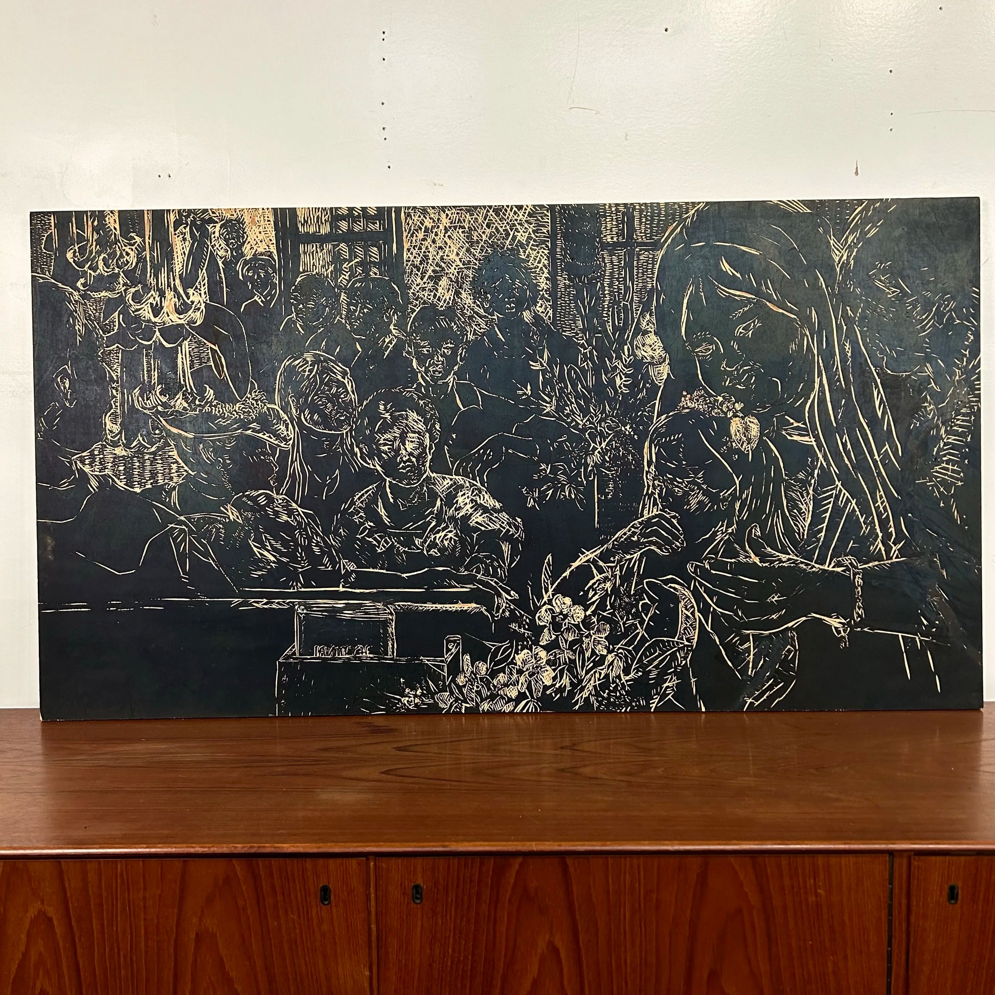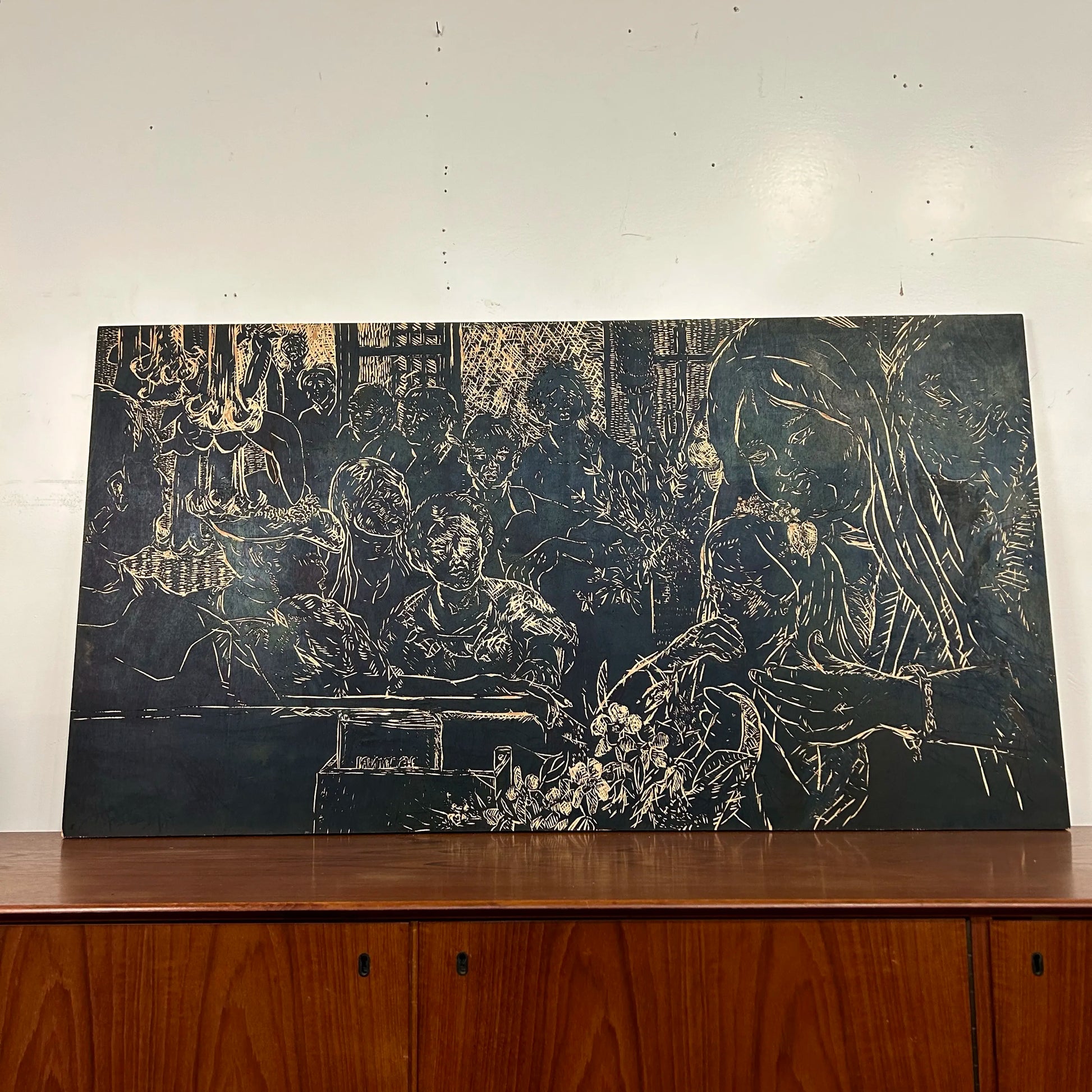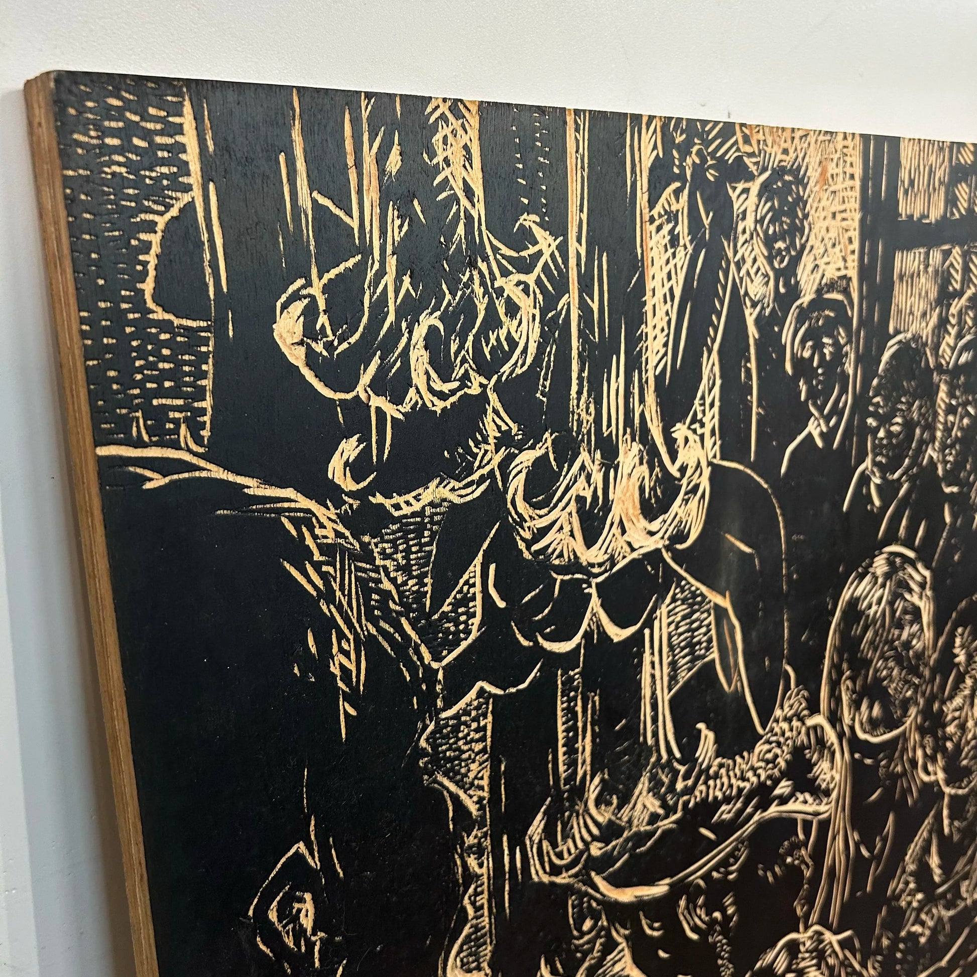Woodcut painting/carving depicting a room filled with many people, flowers, and church benches. I believe the scene to be a funeral as it looks like the women in the forefront are being consoled. The piece is on a sheet of plywood without any hanging wire so the piece will need to be framed or have wire installed.