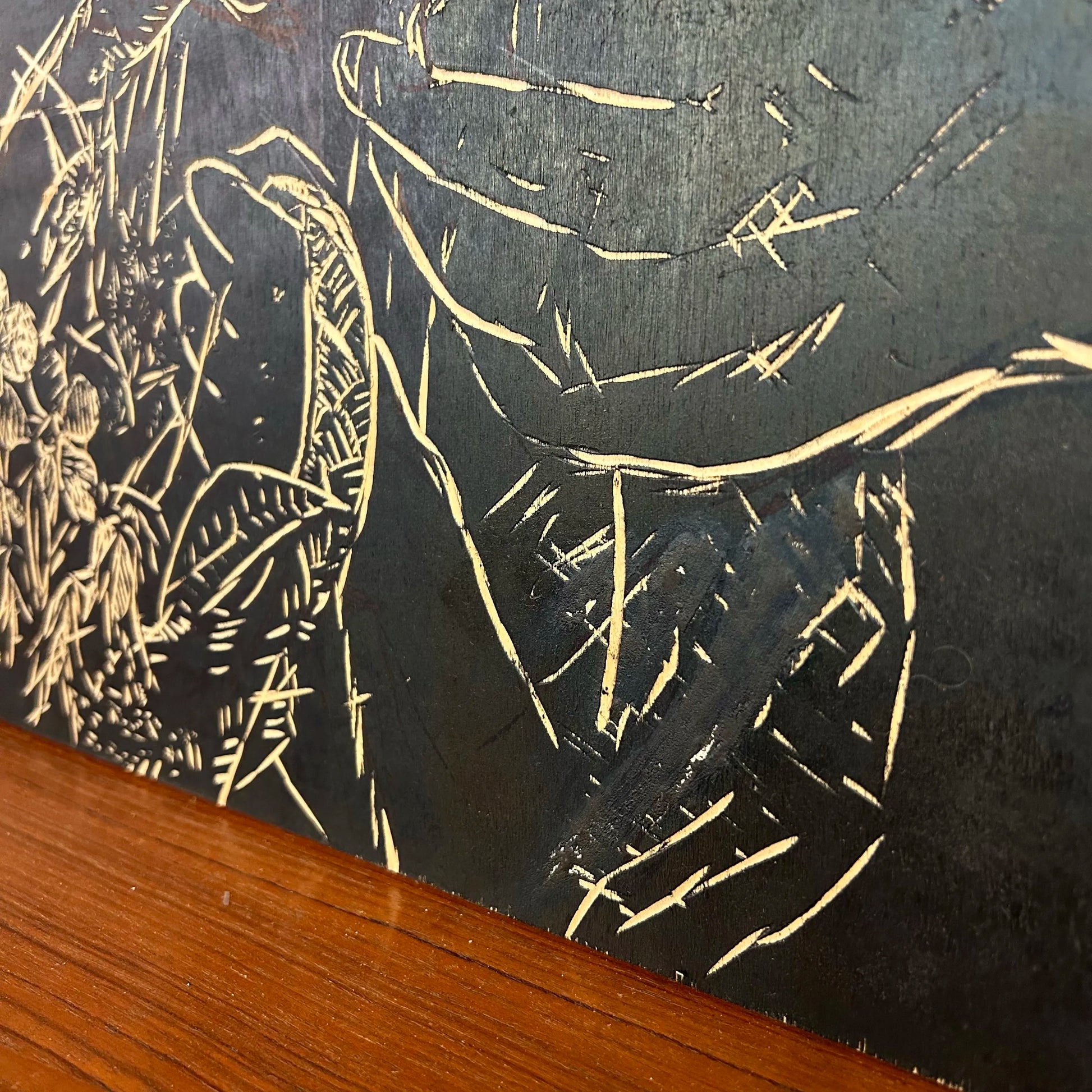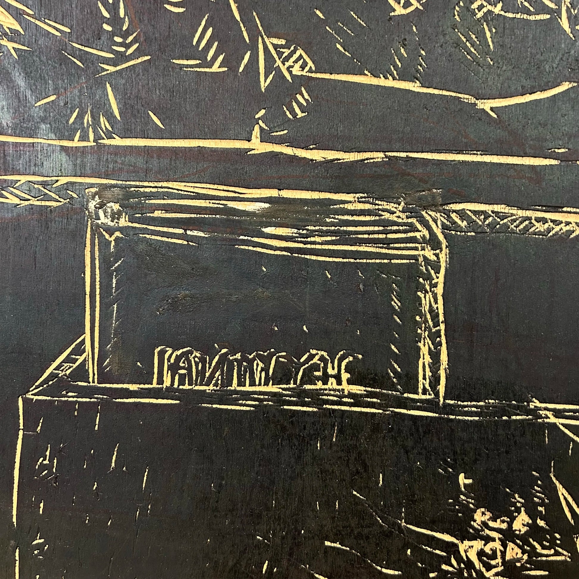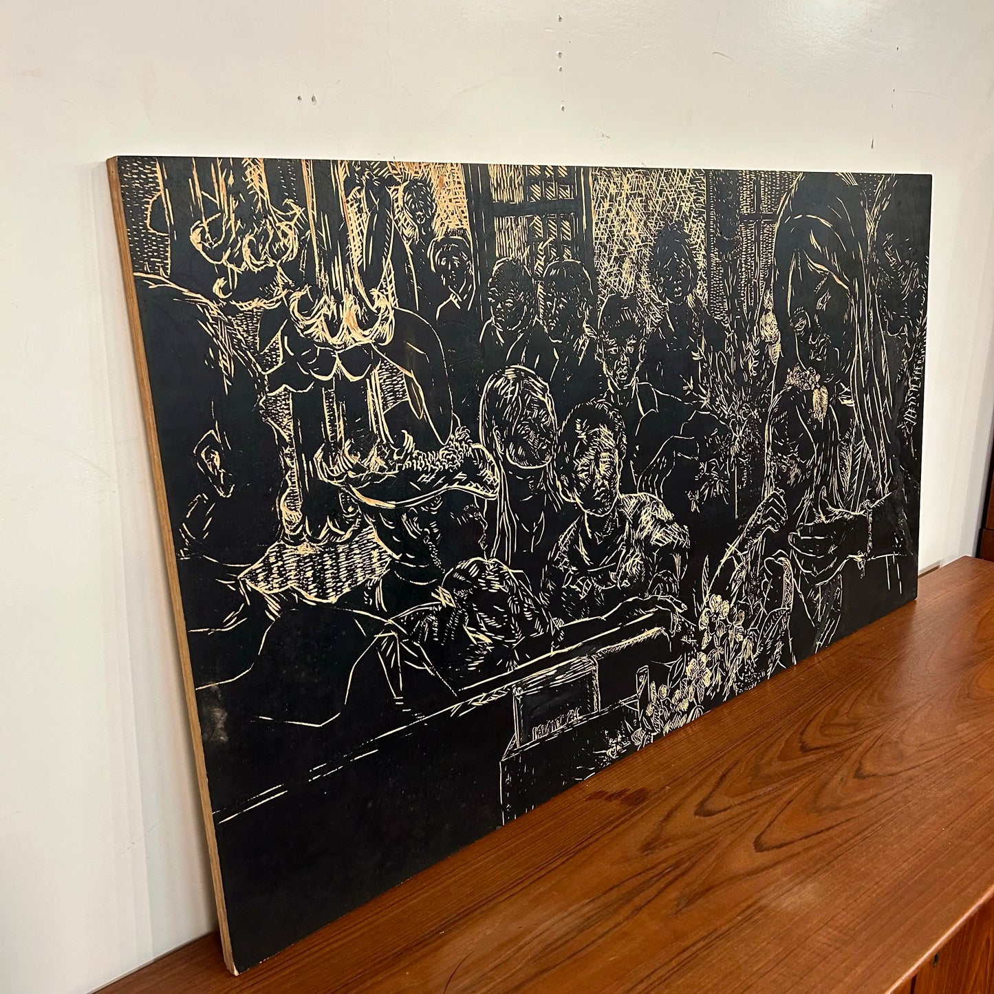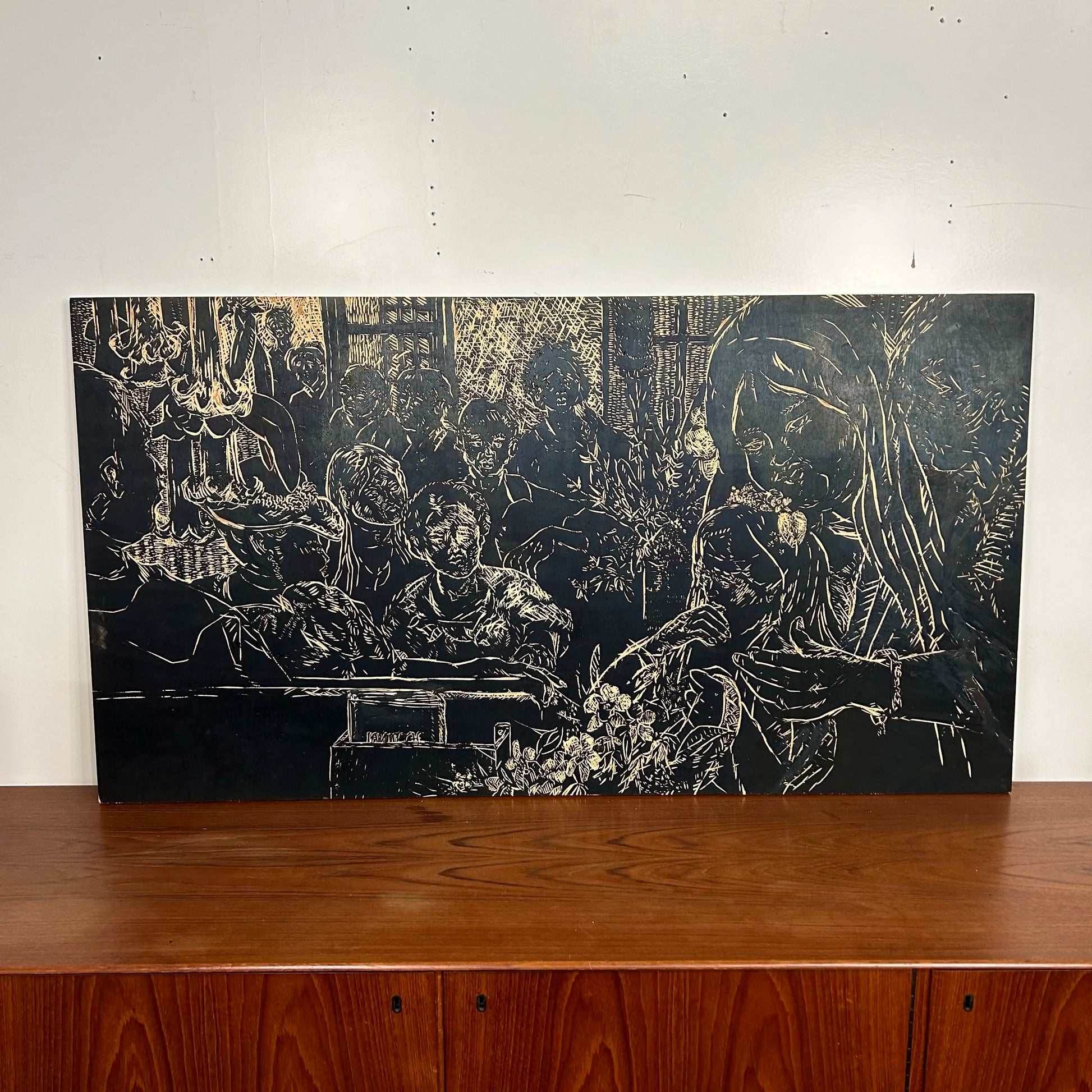 Woodcut painting/carving depicting a room filled with many people, flowers, and church benches. I believe the scene to be a funeral as it looks like the women in the forefront are being consoled. The piece is on a sheet of plywood without any hanging wire so the piece will need to be framed or have wire installed.