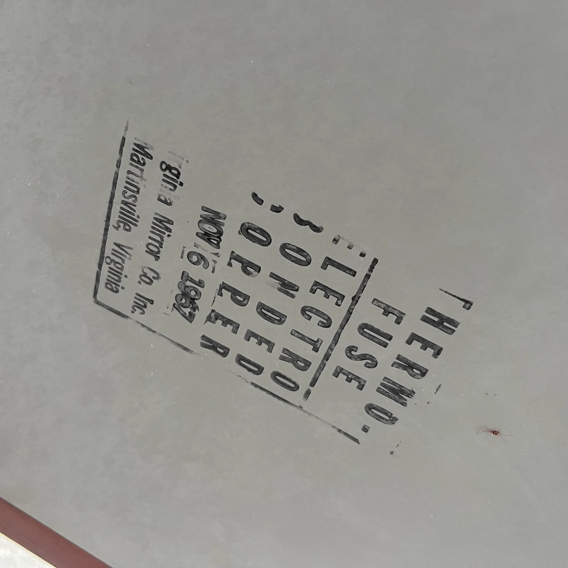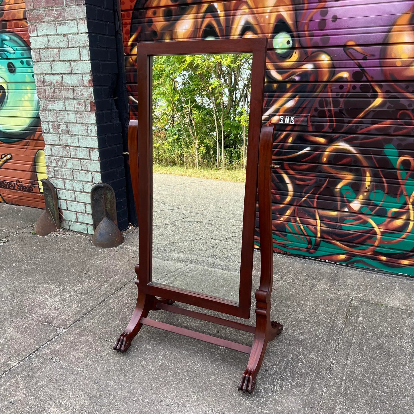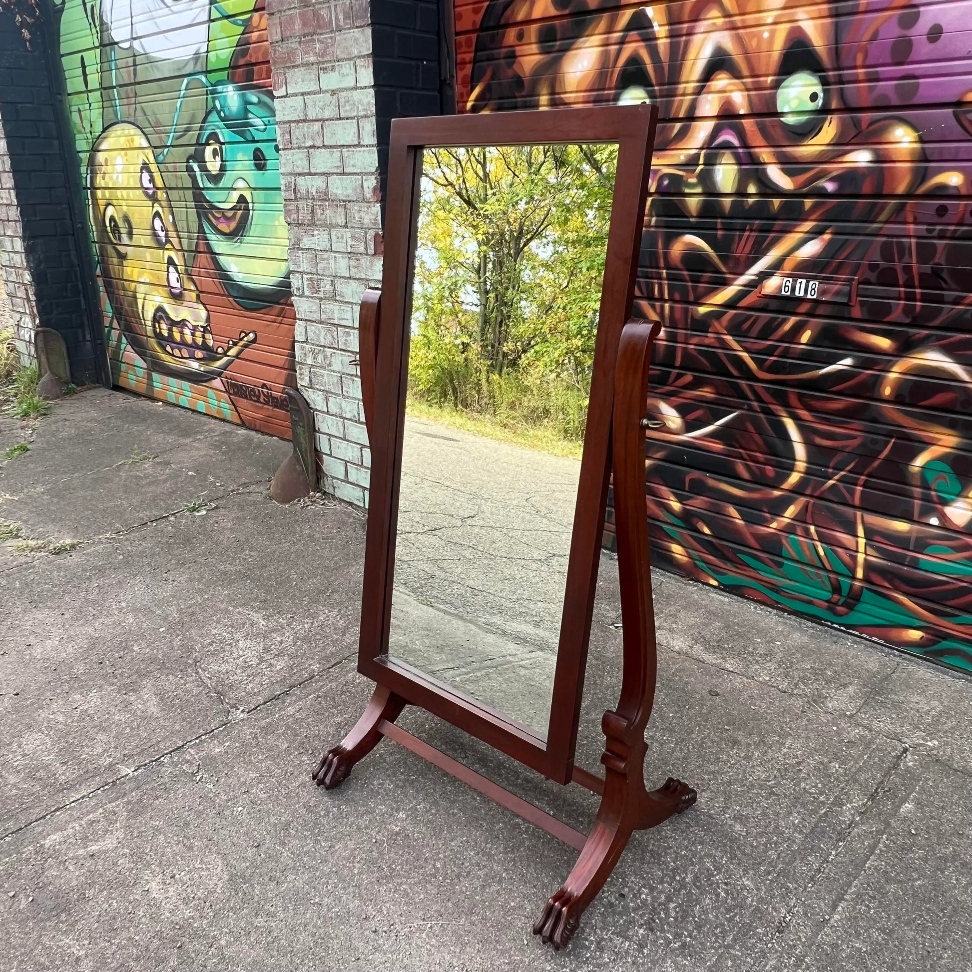 Elevate your space with the timeless charm of a Wooden Cheval Mirror, proudly crafted by the Virginia Mirror Co. Inc. in Martinsville, Virginia. This exquisite piece, adorned with distinctive clam feet, stands as a testament to meticulous craftsmanship. Stamped with history, the mirror bears the mark of November 6th, 1967, capturing a moment frozen in time. Reflecting both form and function, this cheval mirror not only adds a touch of elegance to your space but also whispers the stories of its origin. Embrace the beauty and history encapsulated in this vintage gem.