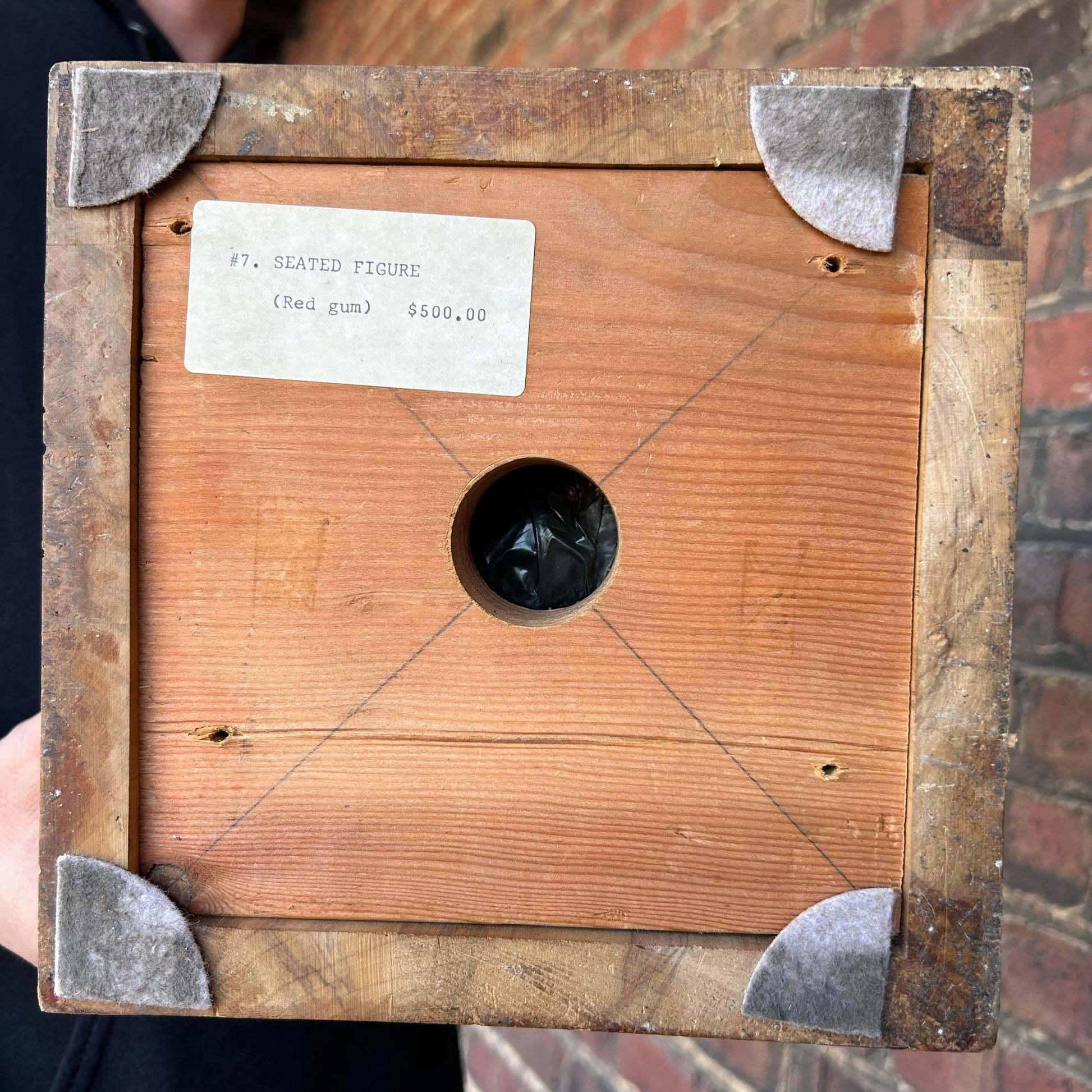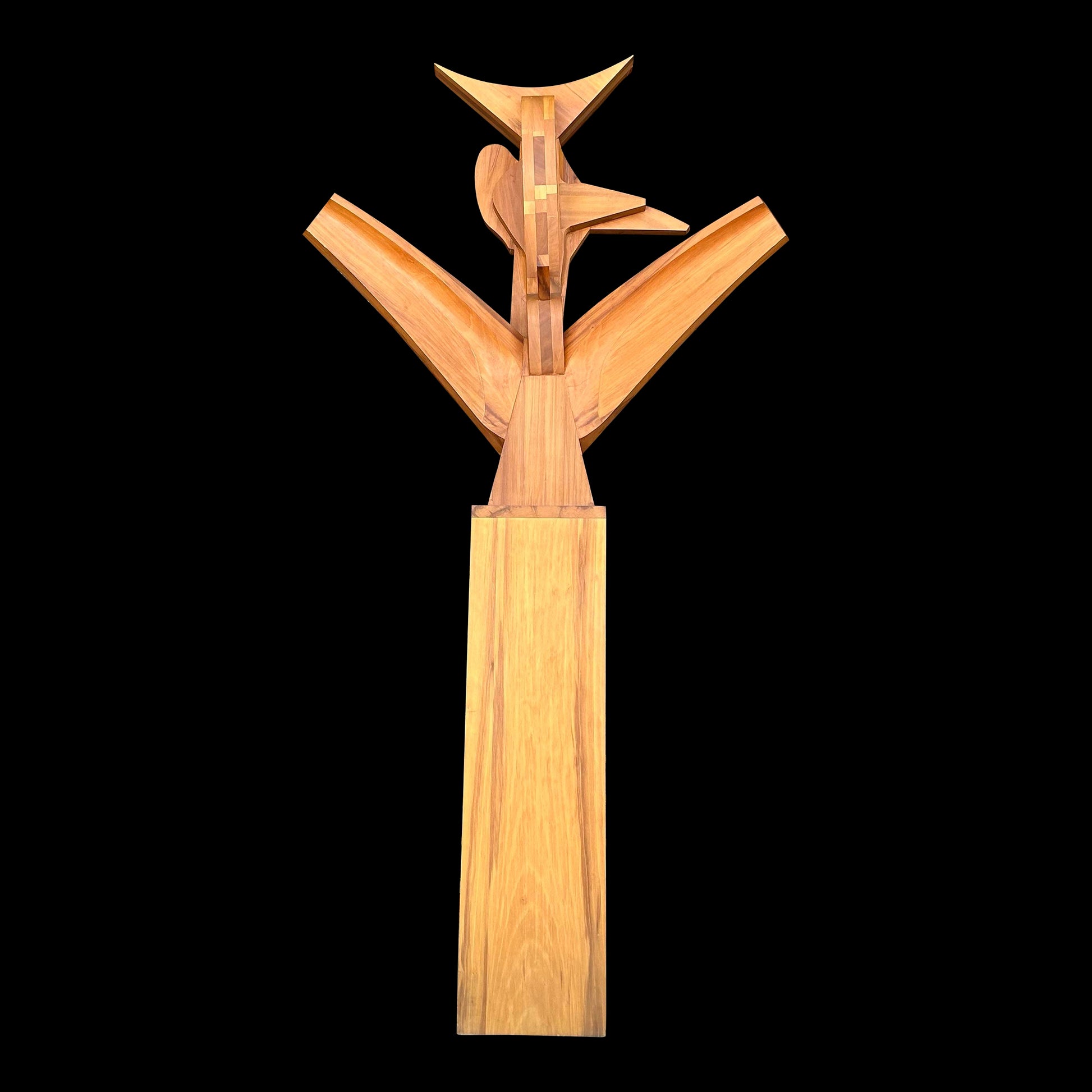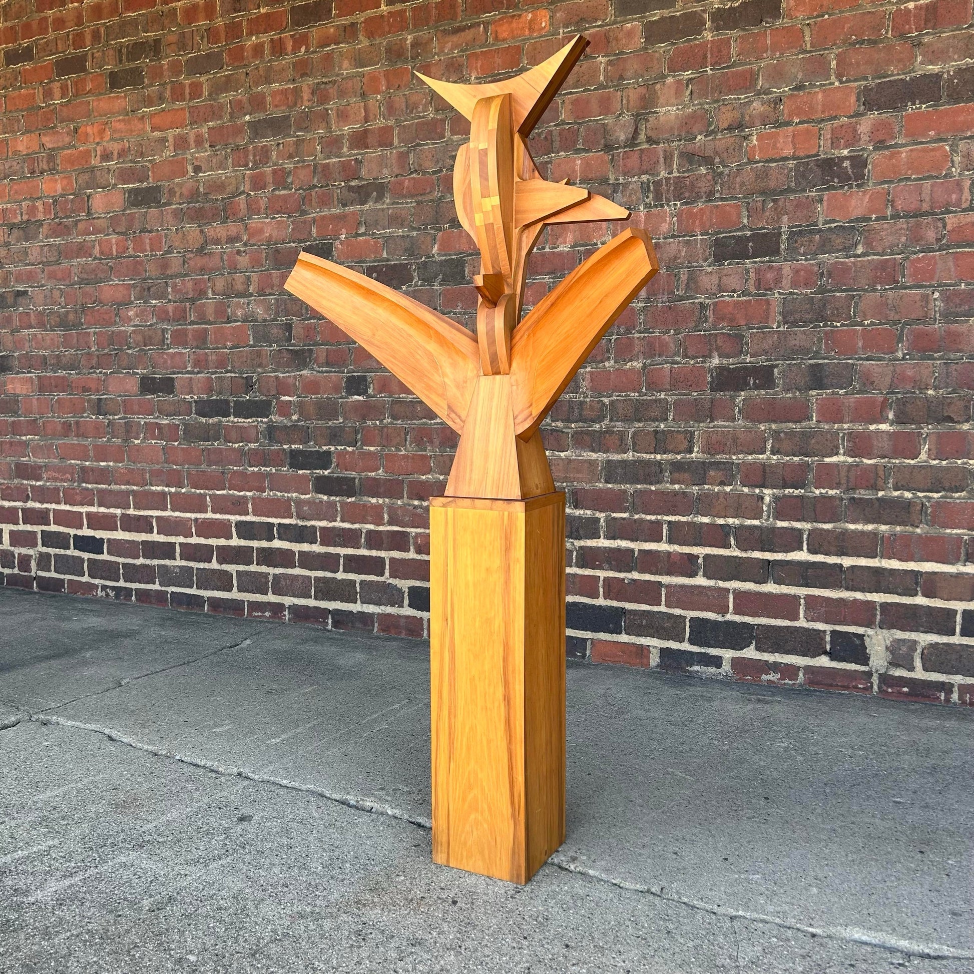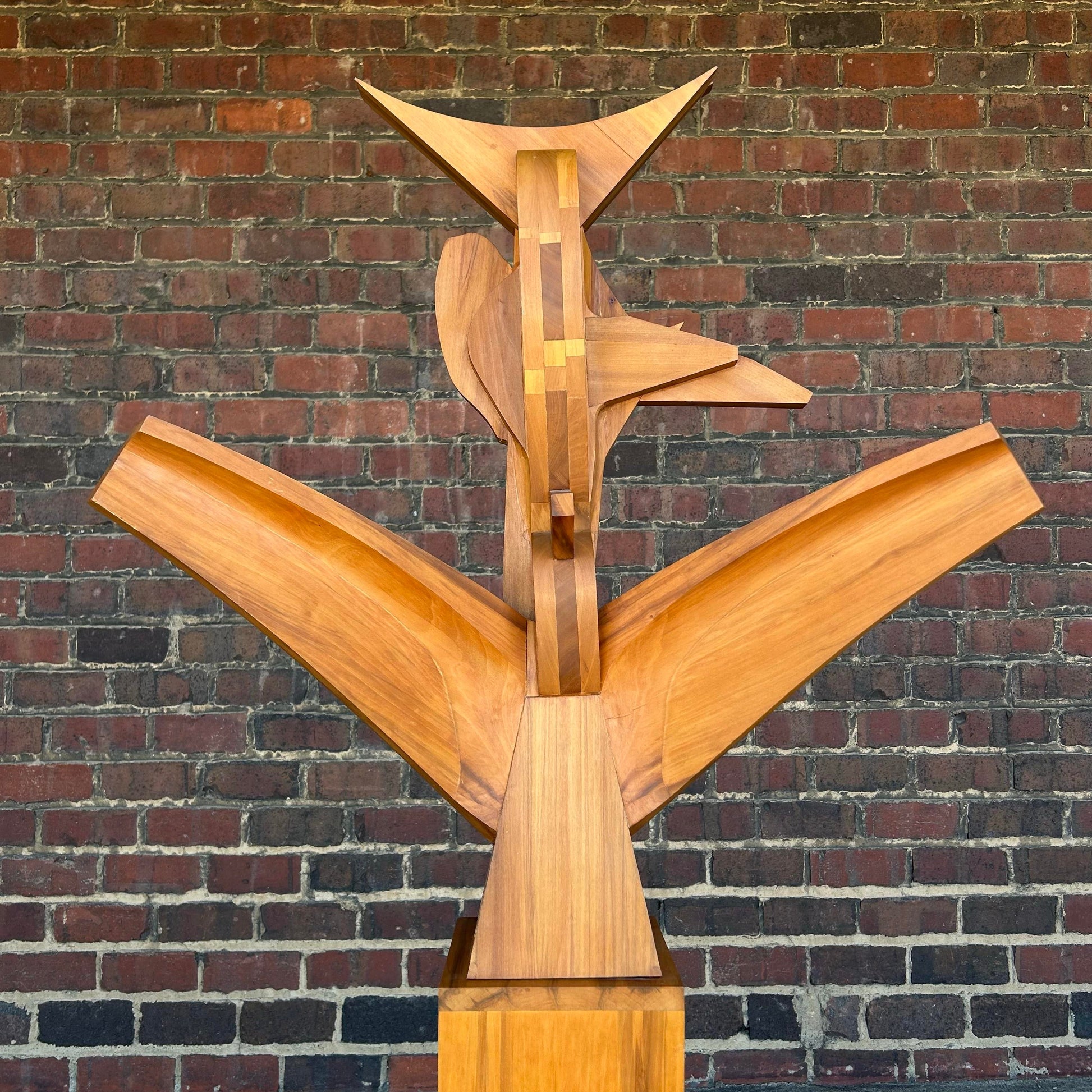 This sculpture is incredible with some elements of cubism. It’s constructed of light and medium toned red gum wood in an almost bird shape. It sits atop a square pedestal base. Titled “#7 Seated Figure” signed W. Moore 1977”